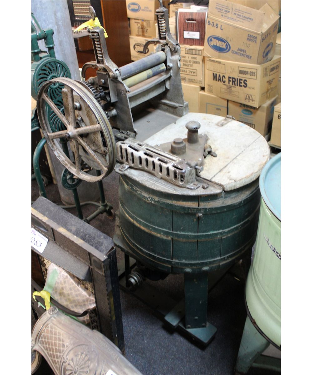 GREEN AND WHITE BEATTY BROS LIMITED WASHING TUB WITH LARGE METAL FLY WHEEL AND INTEGRAL WRINGER