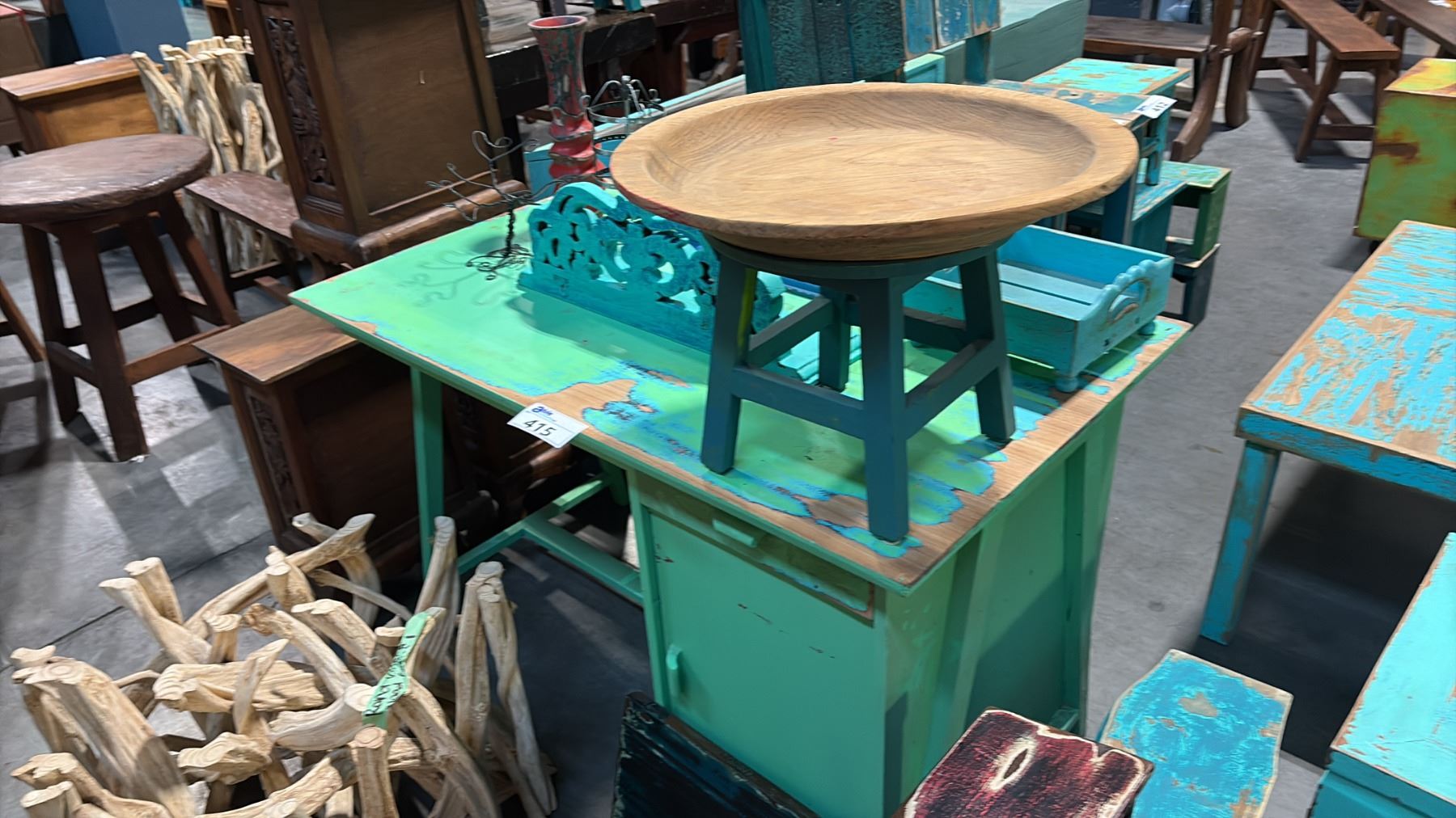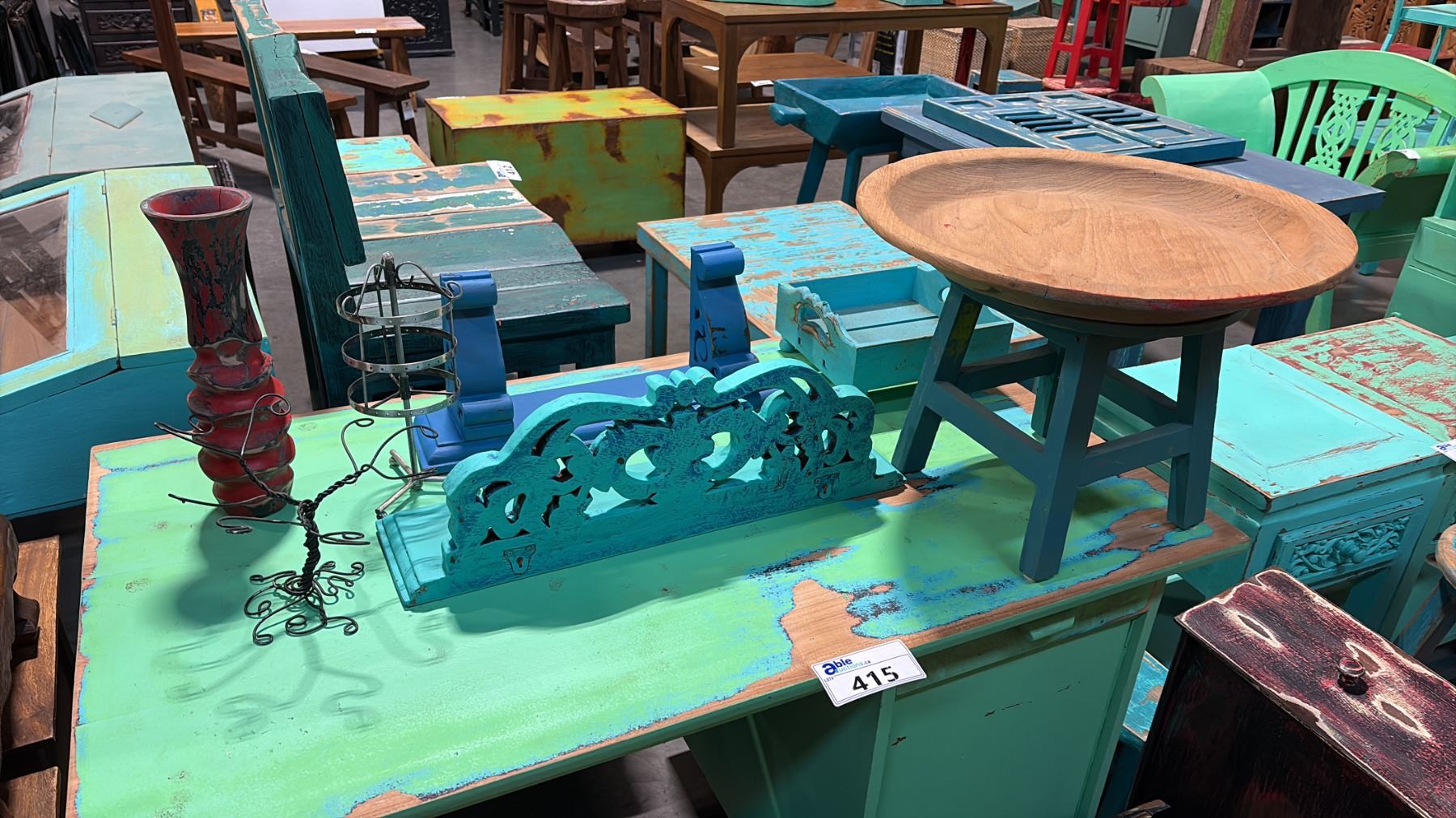 GREEN EXOTIC WOOD DESK 48" X 24" AND MISC DECOR