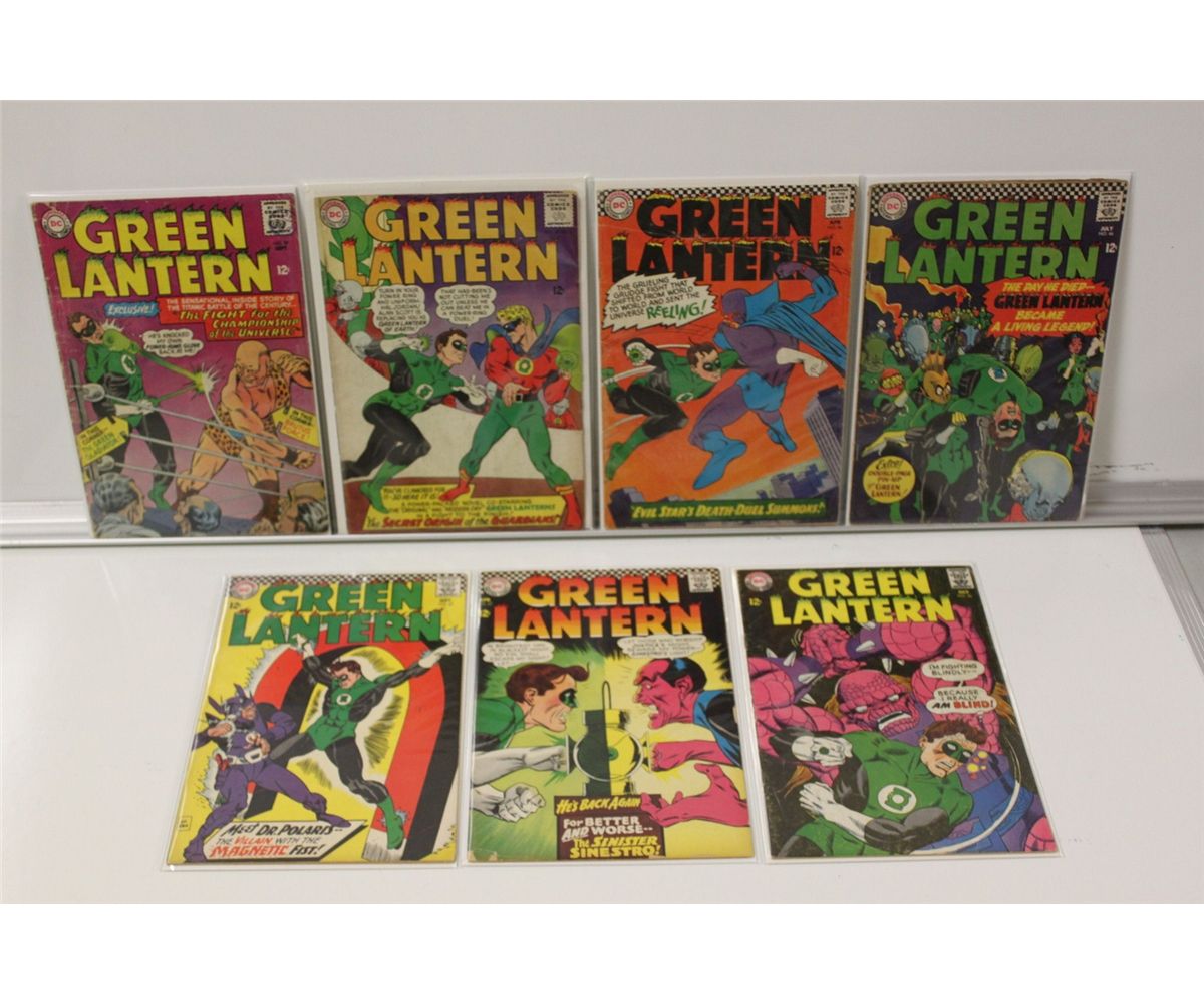GREEN LANTERN SILVER AGE LOT (7 ISSUES) #39 - 40 *KEY ISSUE* ORIGIN OF INFINITE EARTHS, ORIGIN THE GUARDIANS (1965) #44, 46 - 47, 52 & 56 (LOW TO LOWER MID GRADE) COVERS & CENTRE FOLD ATTACHED, ALL COMPLETE, SOLID COPIES