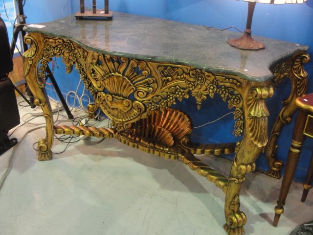 GREEN MARBLE TOP HEAVILY CARVED MAHOGANY GUILD PAINTED HALL/ ACCENT TABLE