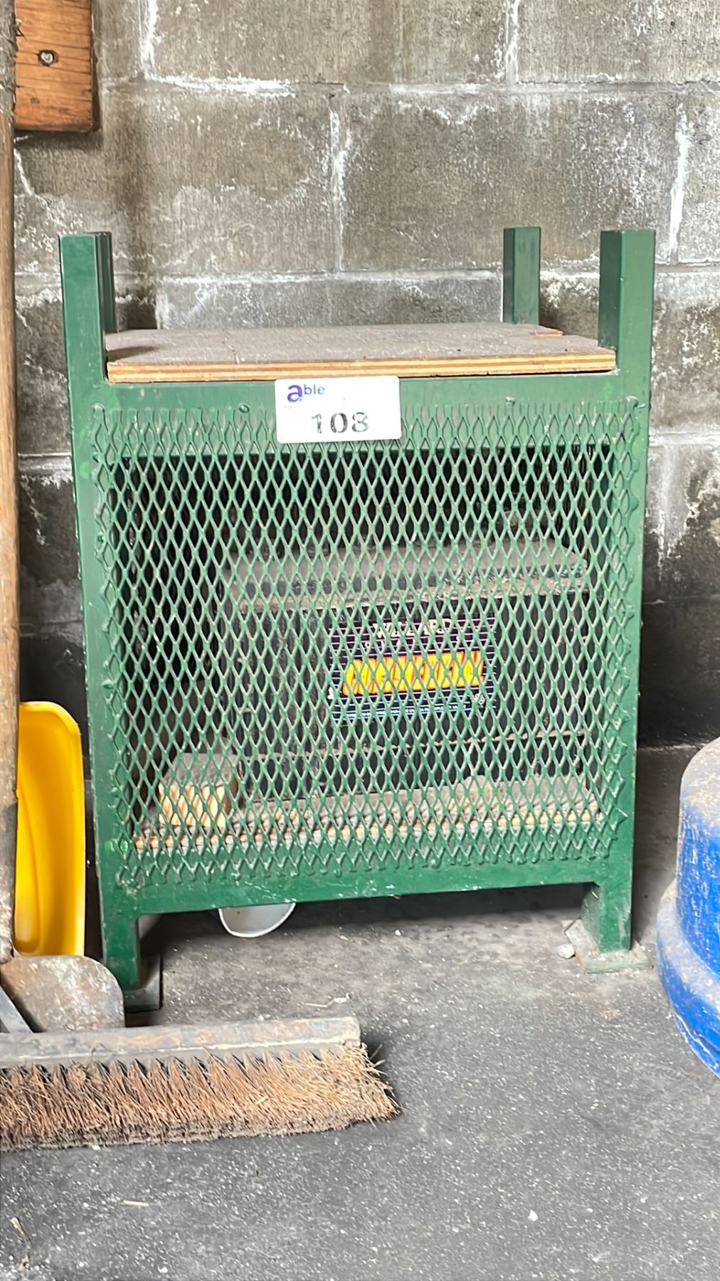 GREEN METAL BATTERY STORAGE BOX W/2 USED BATTERIES, ASSORTED HAND TOOLS AND ADJUSTABLE PEDESTAL STAND