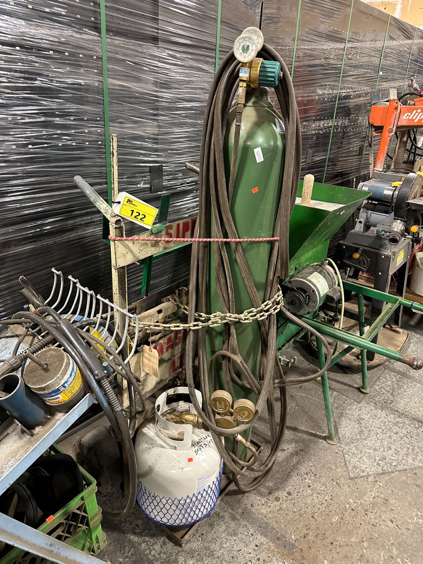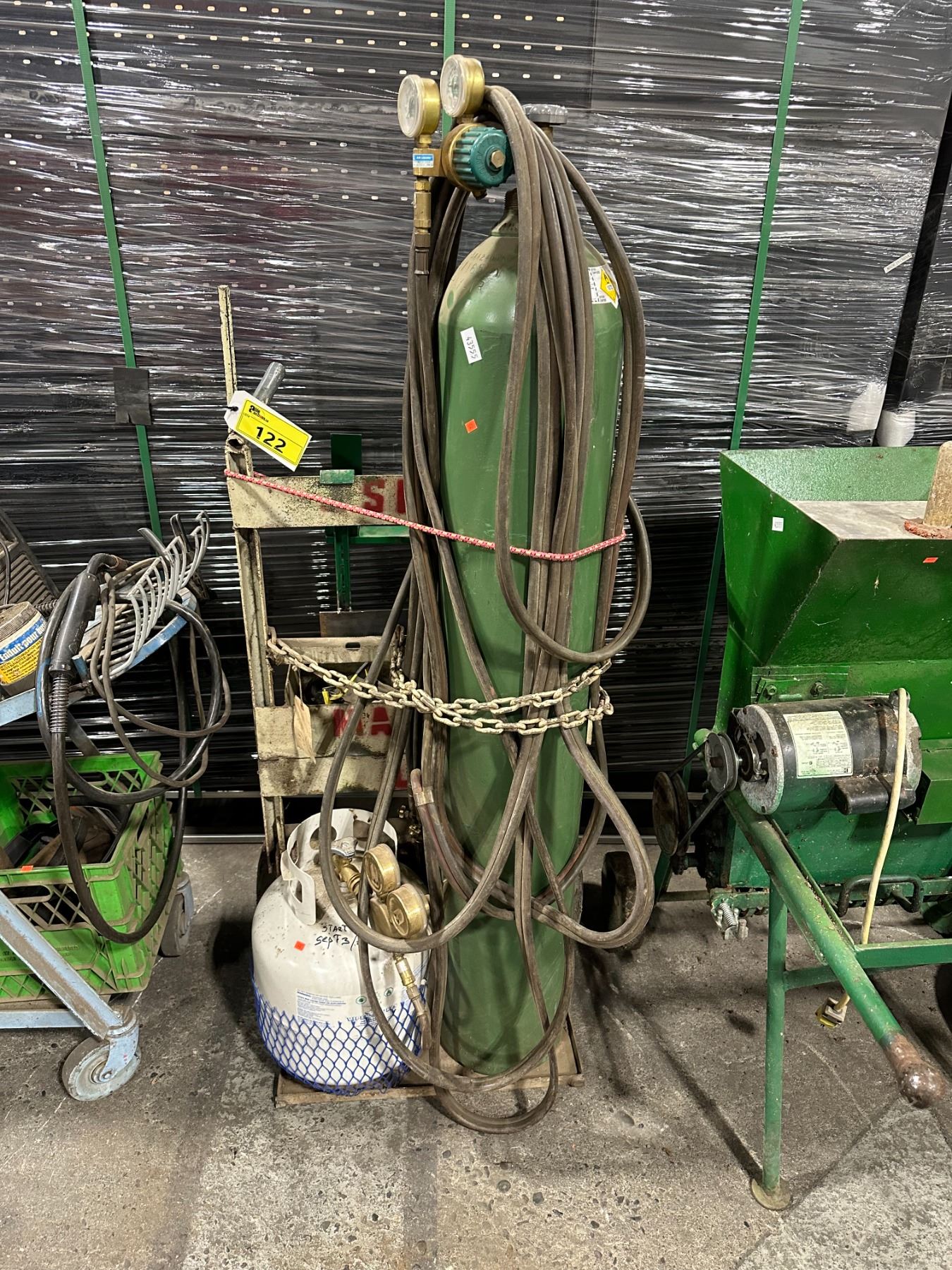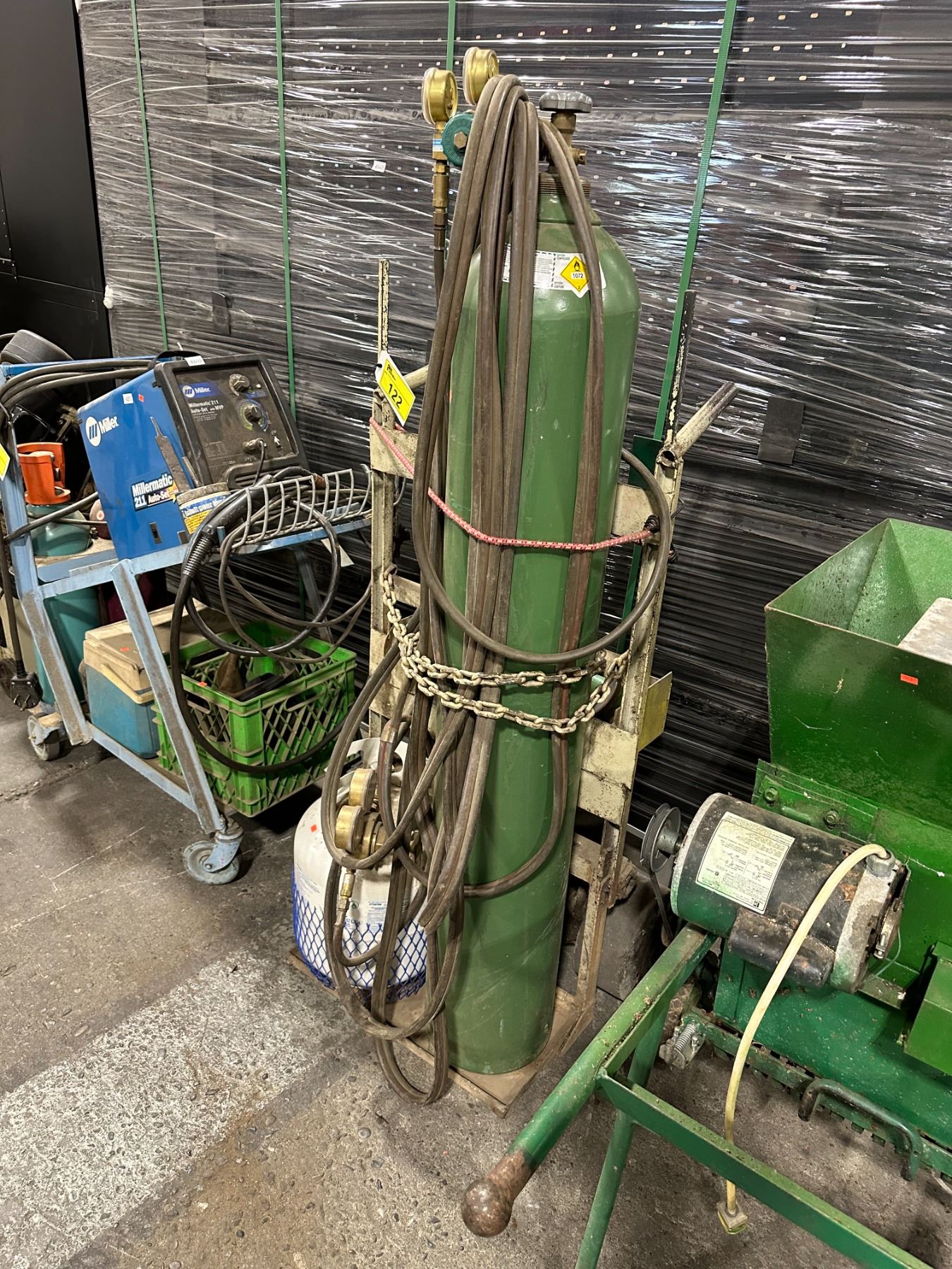 GREEN MOBILE INDUSTRIAL TORCH CART WITH BOTTLES, GAUGES, HOSES, & TORCH