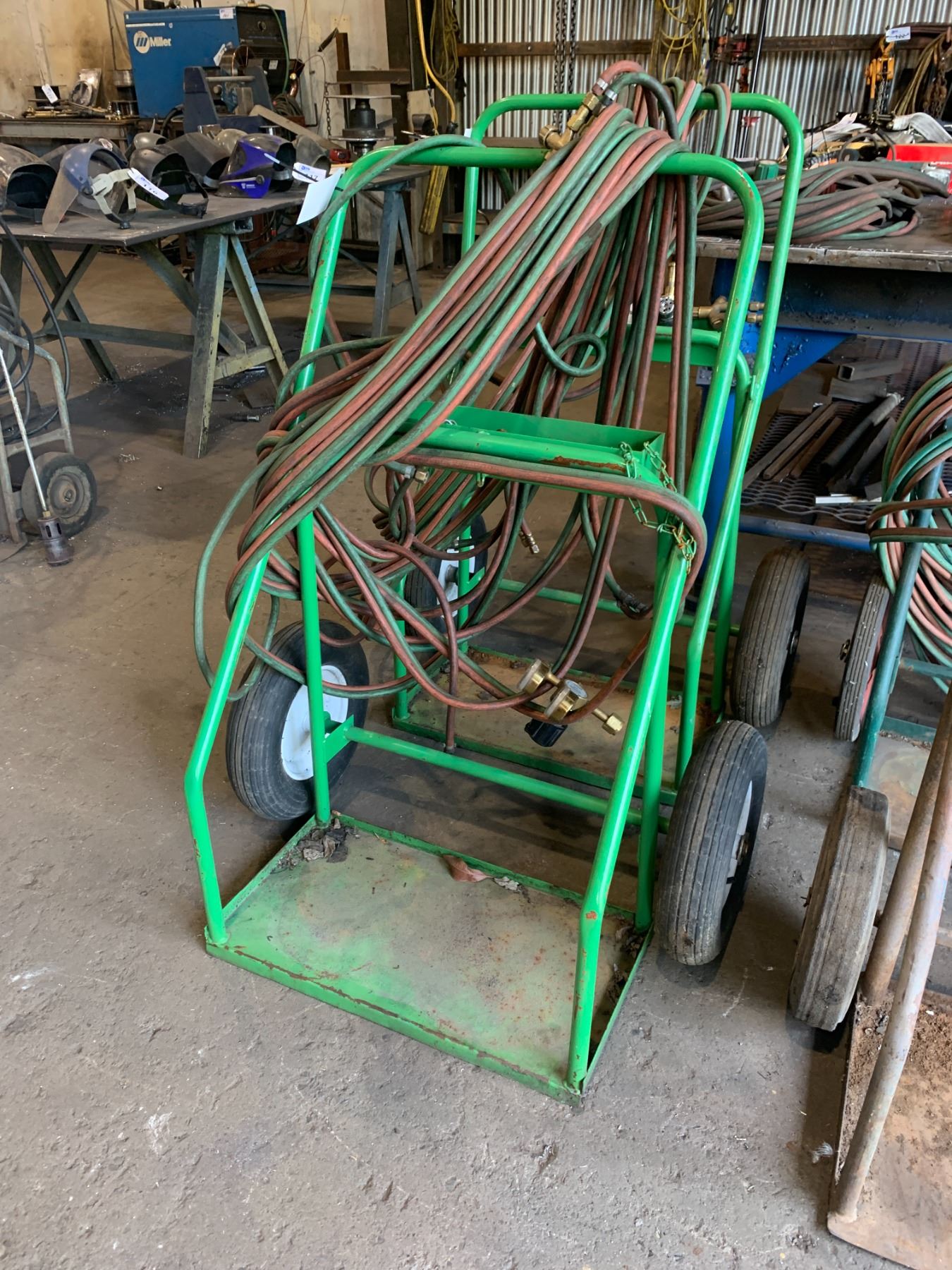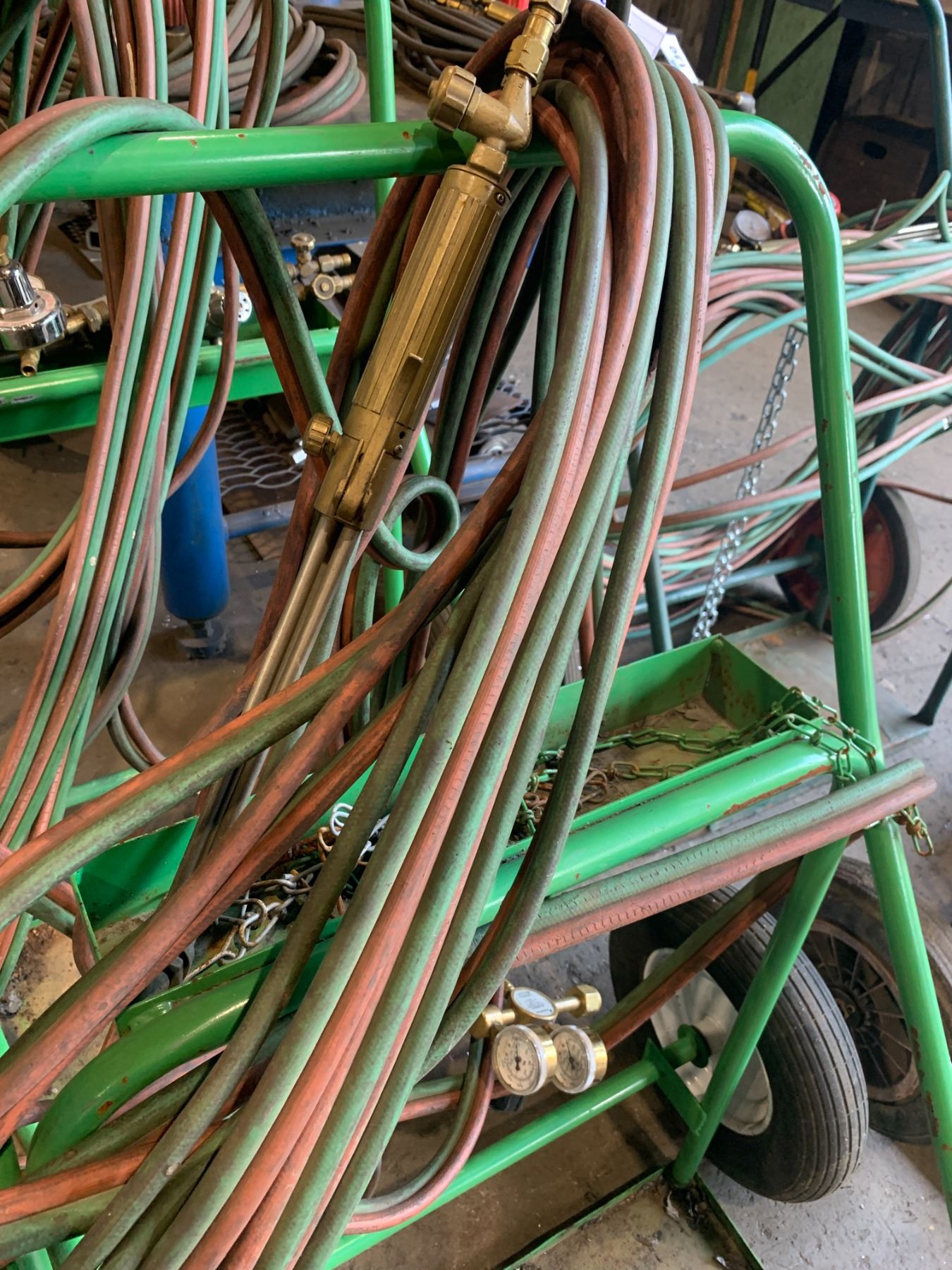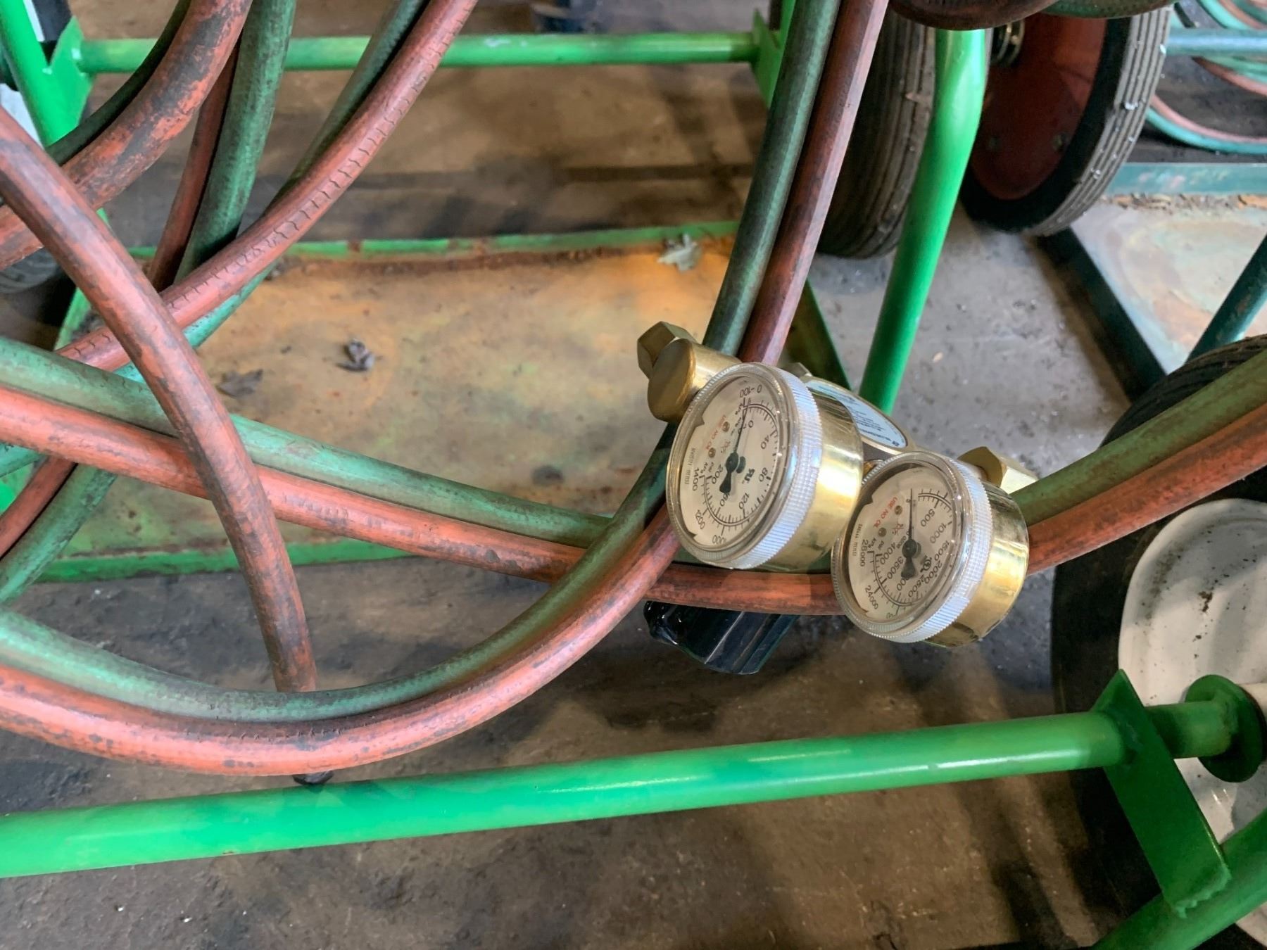 GREEN OXY ACETYLENE WELDERS DOLLY WITH TORCH, GAUGES & HOSE LINES