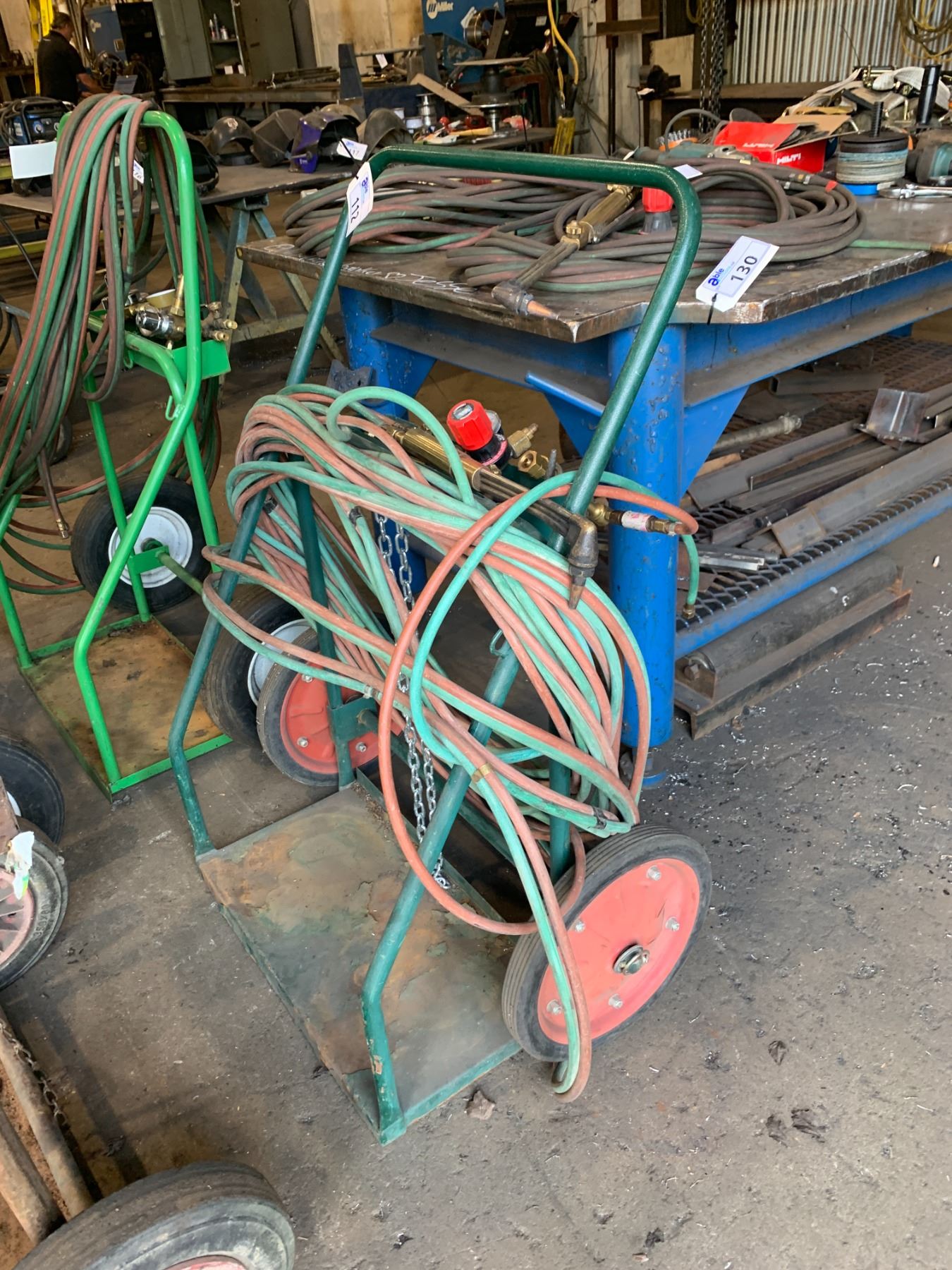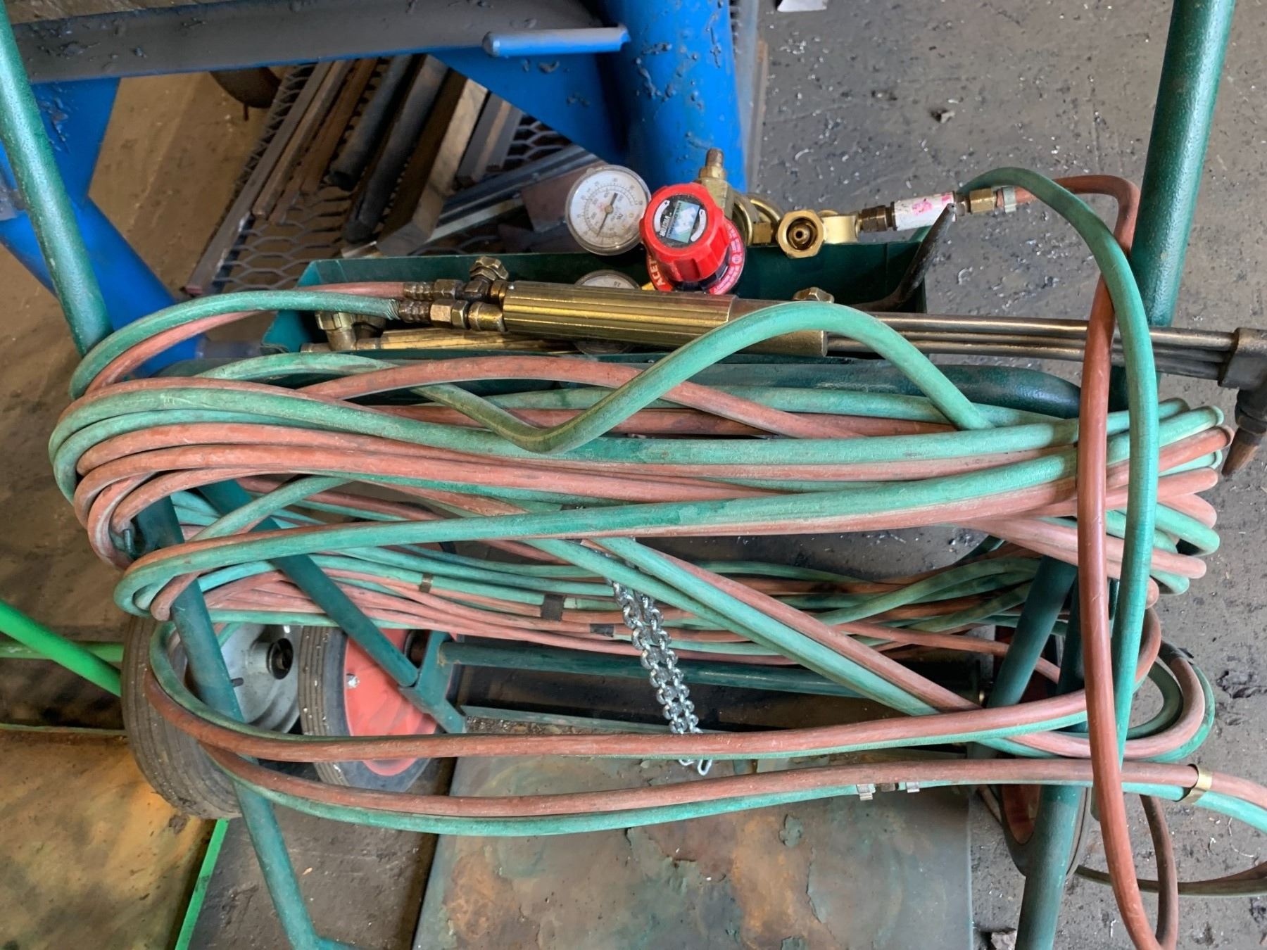 GREEN OXY ACETYLENE WELDERS DOLLY WITH TORCH, GAUGES & HOSE LINES