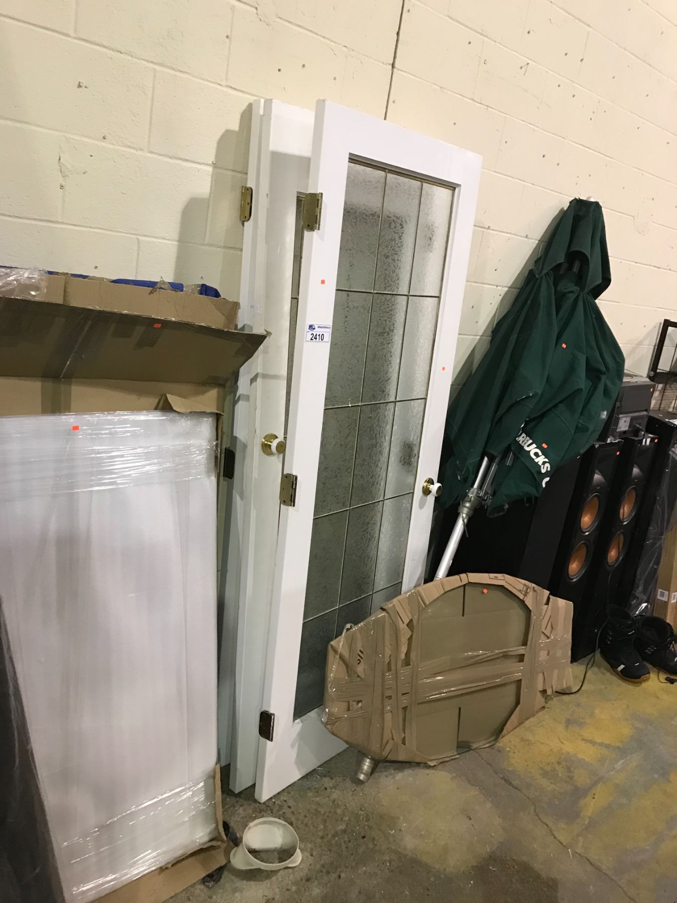 GREEN PATIO UMBRELLA, 2 PANE DOORS, CLOTH BOLT AND MORE MUST TAKE ALL