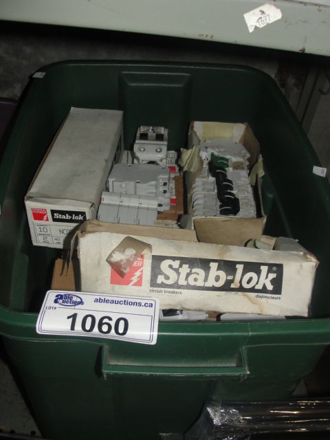 GREEN RUBBERMAID CONTAINER FILLED WITH RESIDENTIAL CIRCUIT BREAKER SWITCHES