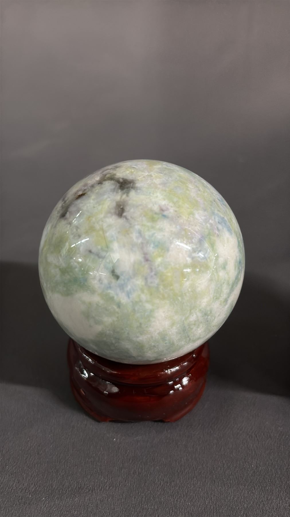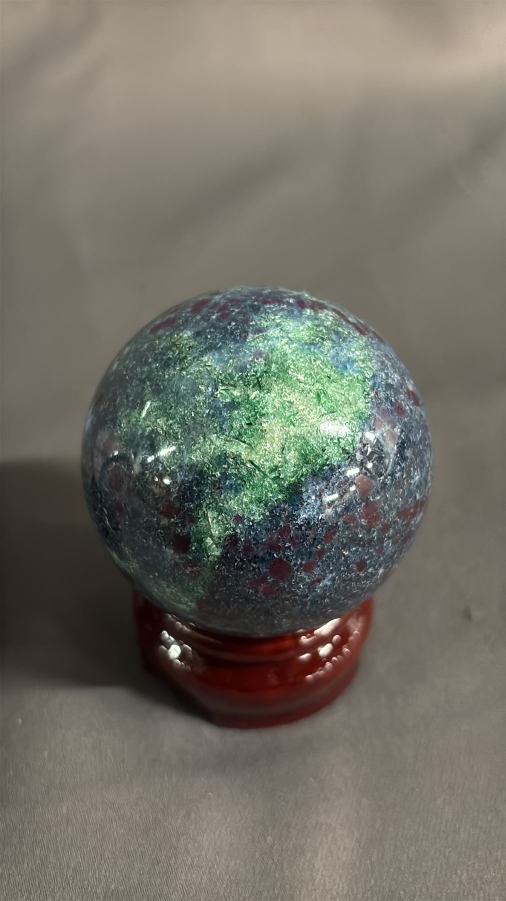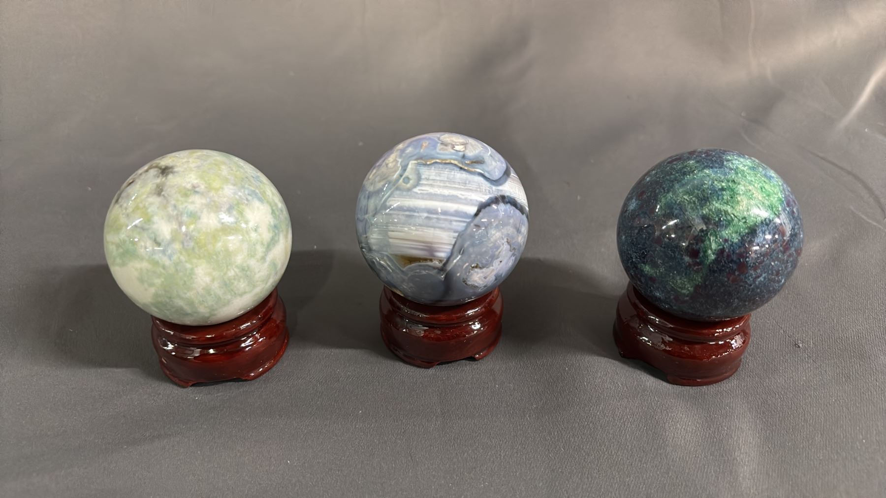 GREEN TOURMALINE QUARTZ, RUBY IN KYANITE & BLUE FLOWER AGATE 2" SPHERES ON STANDS