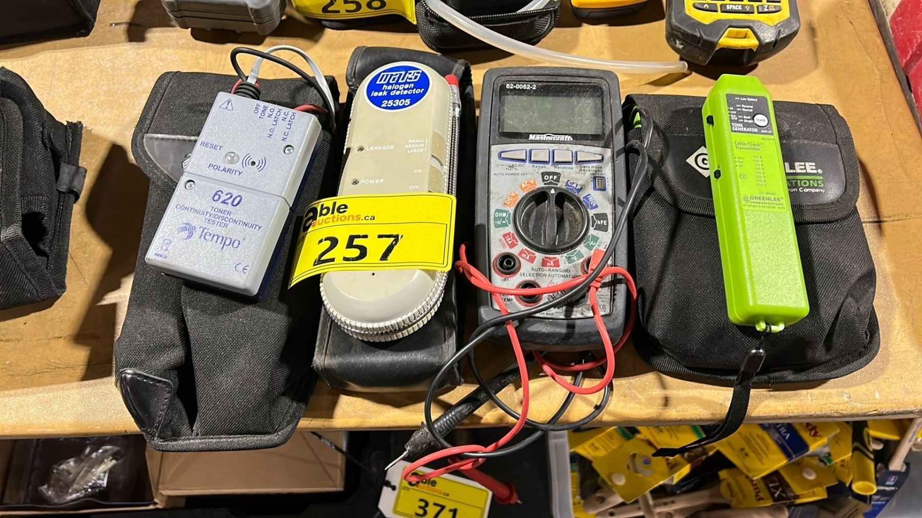 GREENLEE CABLE CHECK TRANSMITTERS IN SOFT TRANSPORT CASE, MASTERCRAFT 52-0052-2 ELECTRICAL TESTER, MARS HALOGEN LEAK DETECTOR WITH SOFT TRANSPORT CASE, & TEMPO 620 CONTINUITY TESTER IN SOFT TRANSPORT CASE