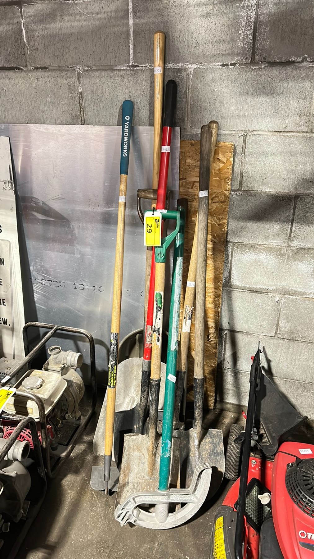 GREENLEE CONDUIT BENDER, 6 ASSORTED SHOVELS & A GREENWORKS HOE