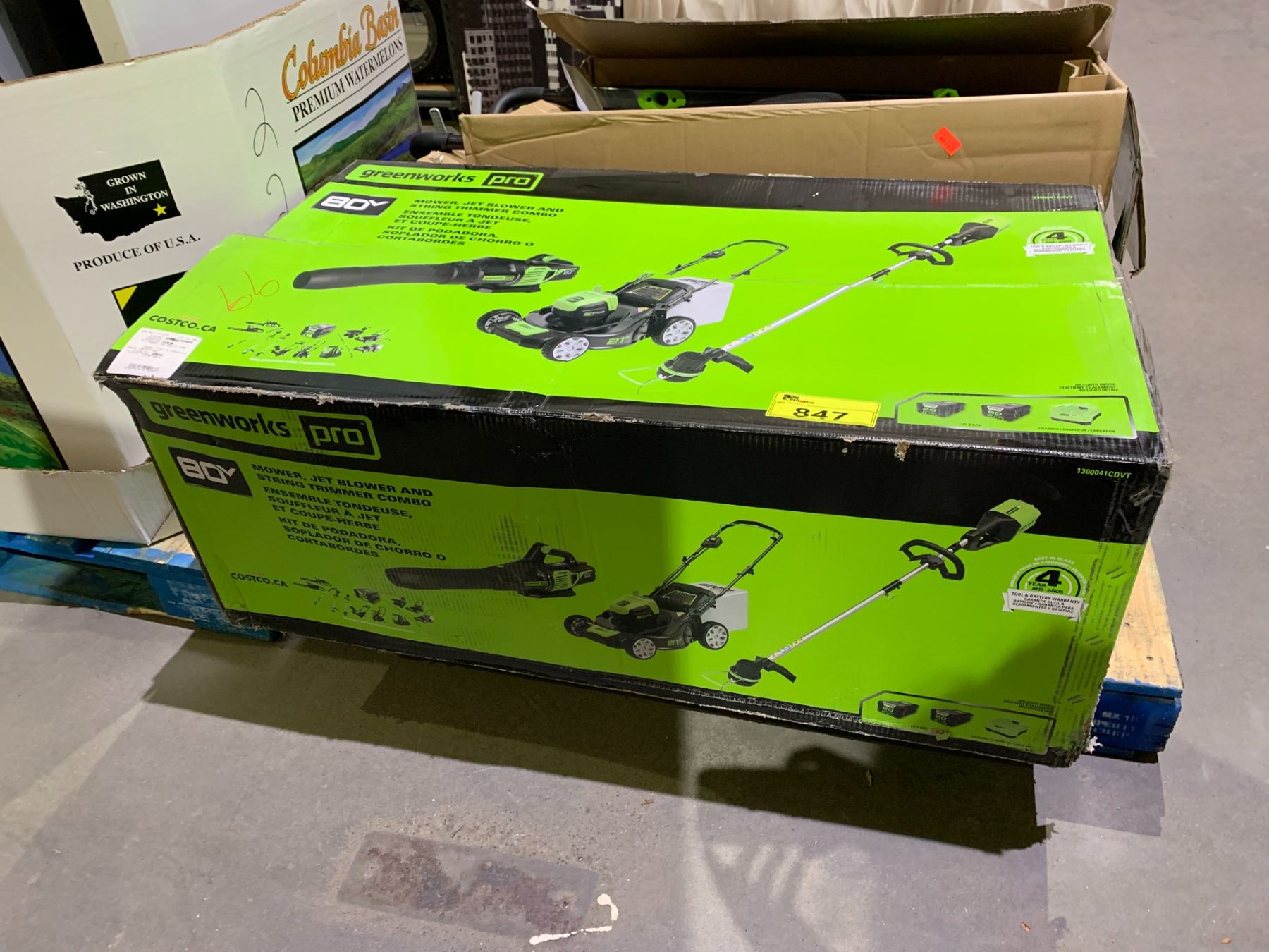 GREENWORKS PRO MOWER, JET BLOWER & STRING TRIMMER COMBO WITH BATTERIES & CHARGER
