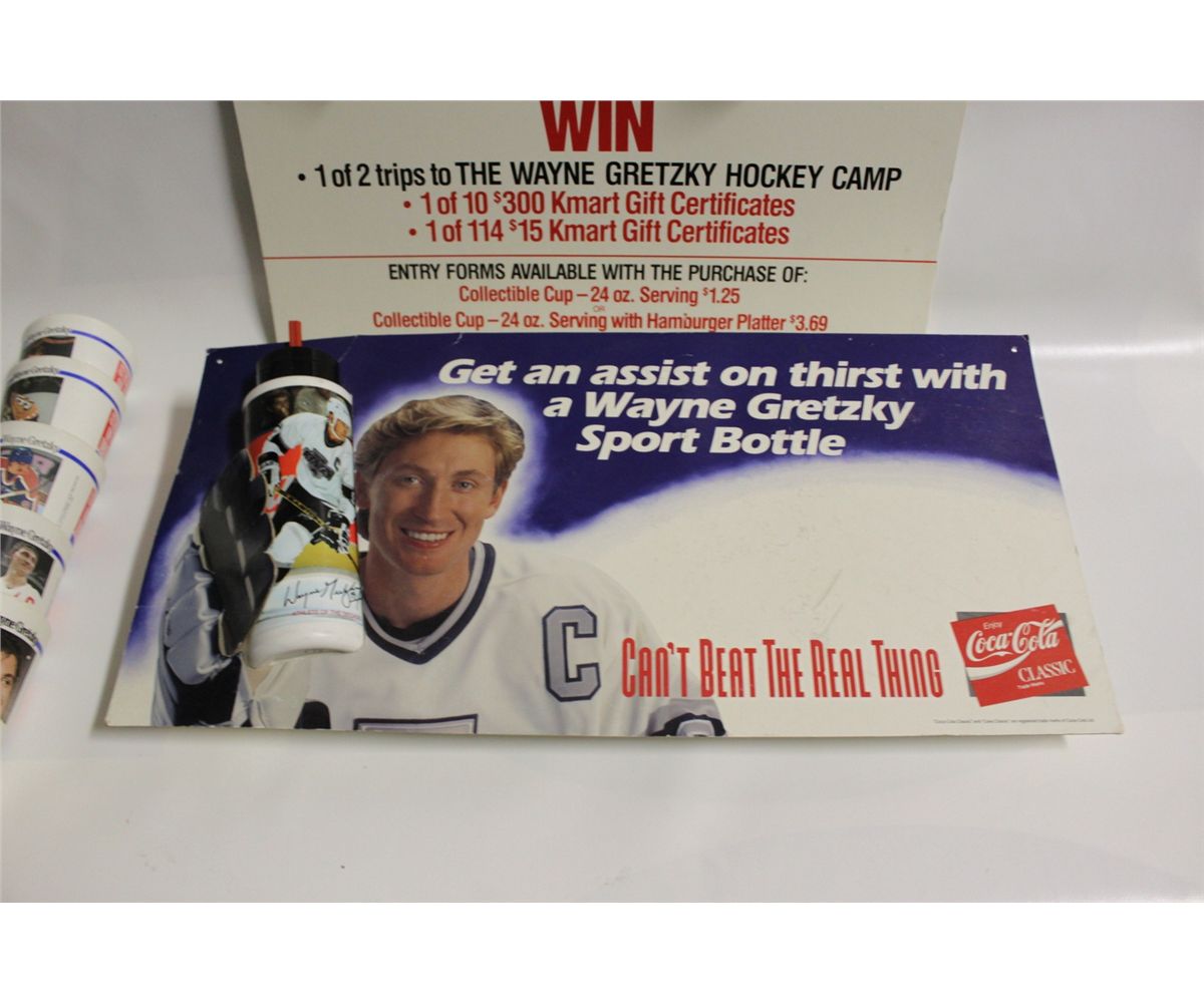 GRETZKY / COCA-COLA COLLECTOR CUPS ON PRESENTATIONAL DISPLAYS INCLUDING: 2 COMPLETE CUP SETS & 1 COLLECTOR SPORTS BOTTLE ON STAND & 3 COLLECTOR SPORTS BOTTLES