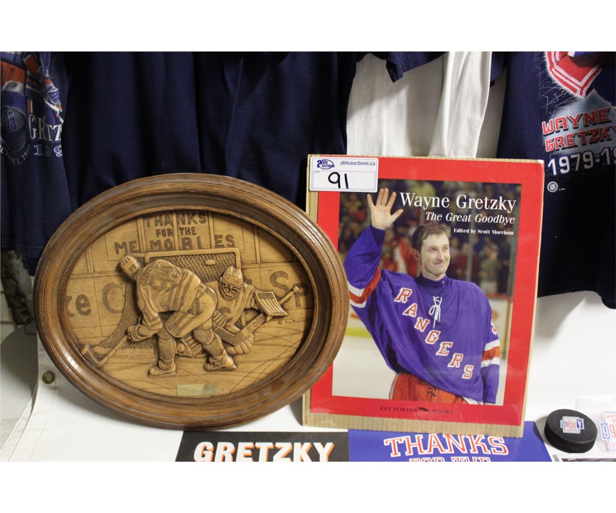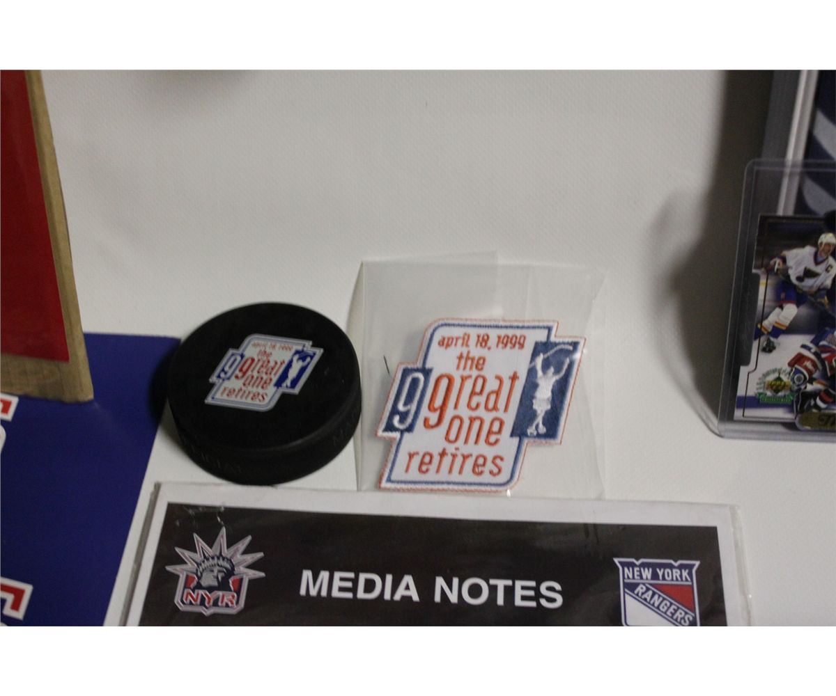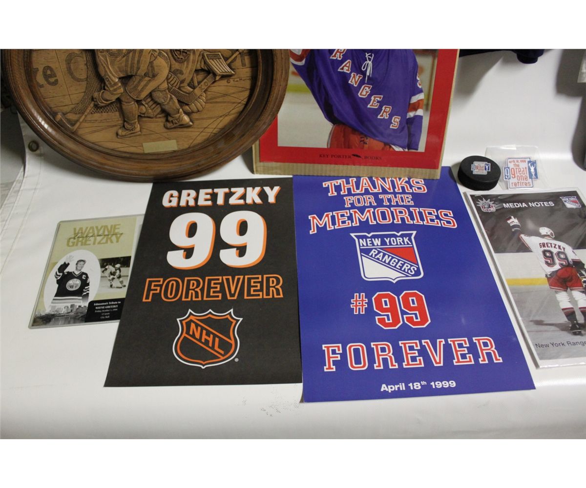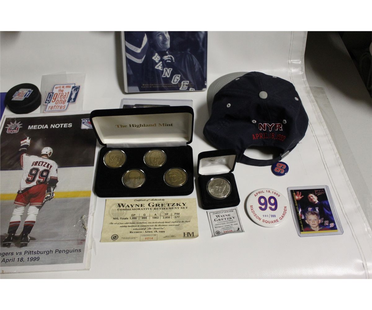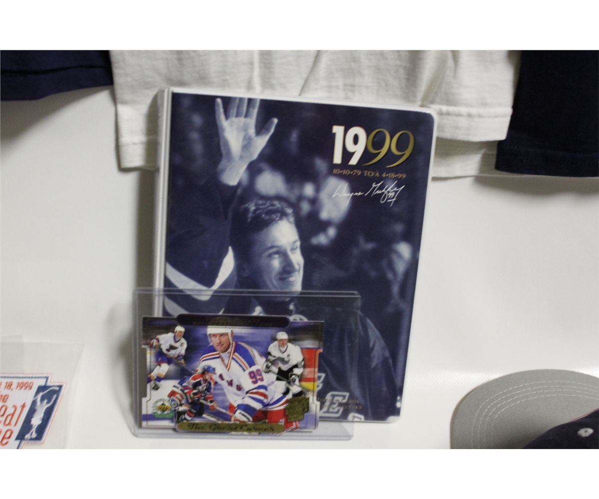 GRETZKY RETIRMENT ITEMS INCLUDING: 7 SHIRTS, WOODEN COMEMORATIVE PLAQUE, 'GRET ONE RETIRES" PUCK AND PATCH, FINAL CARD, 4 GOODBYE POSTERS, COIN AND COLLECTOR COIN SET, APRIL 1999 HAT, 2 BUTTONS, COLLECTOR CARDS IN BOOK AND TRIBUTE PROG
