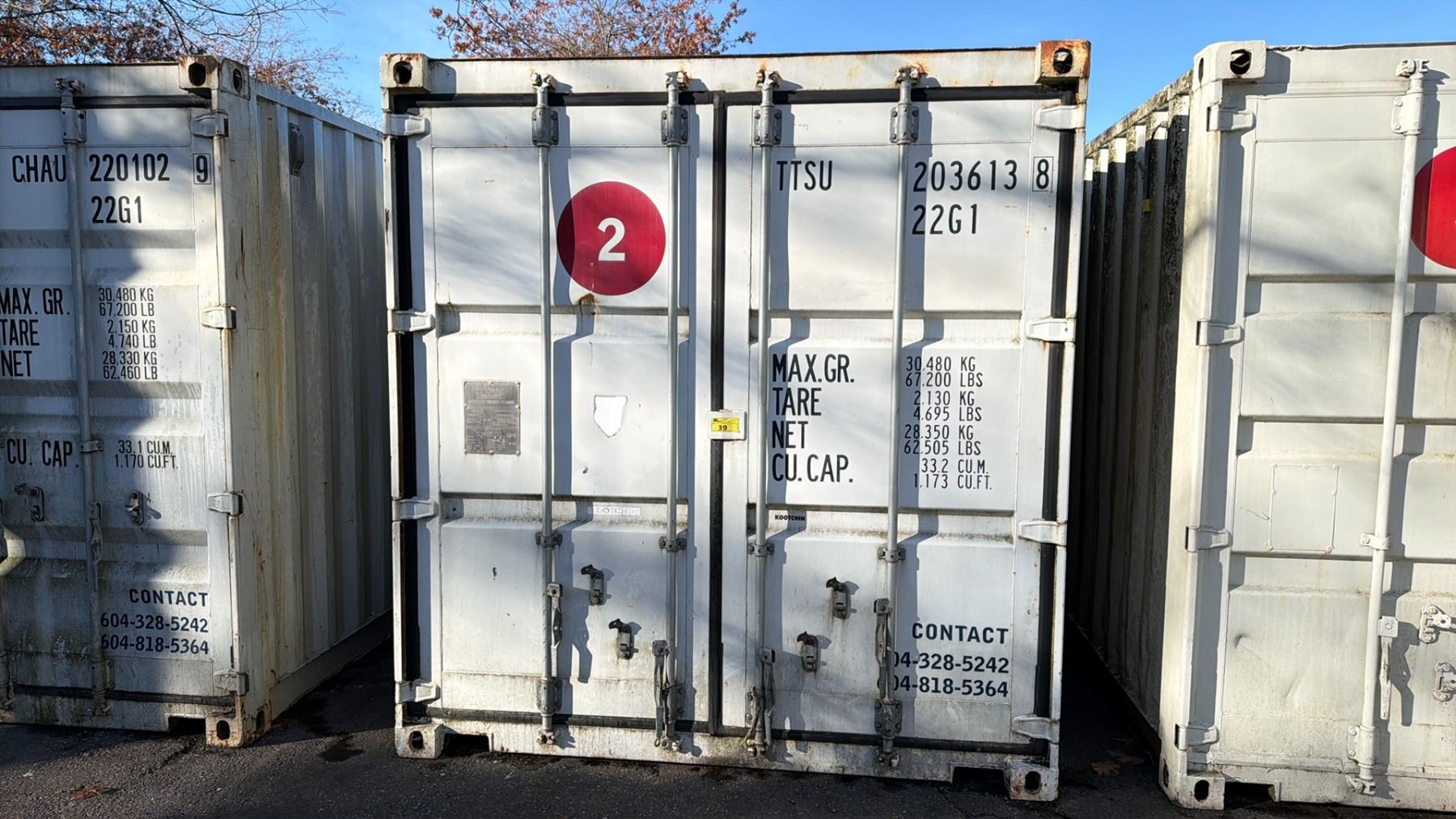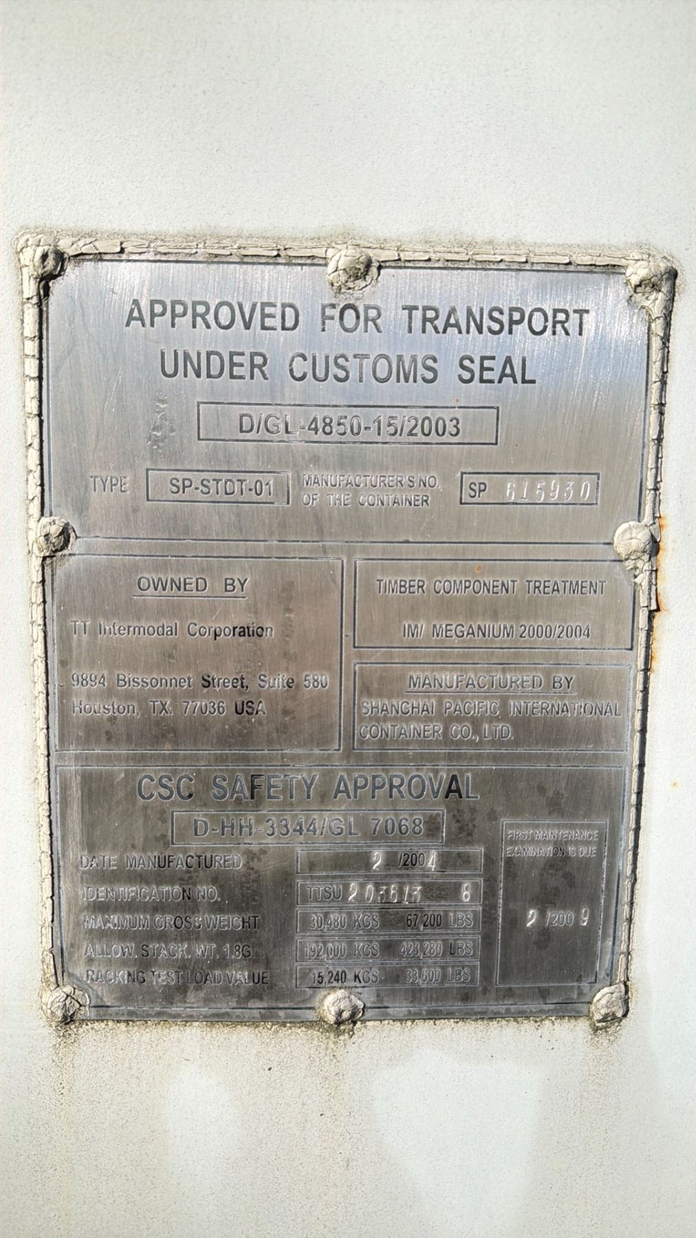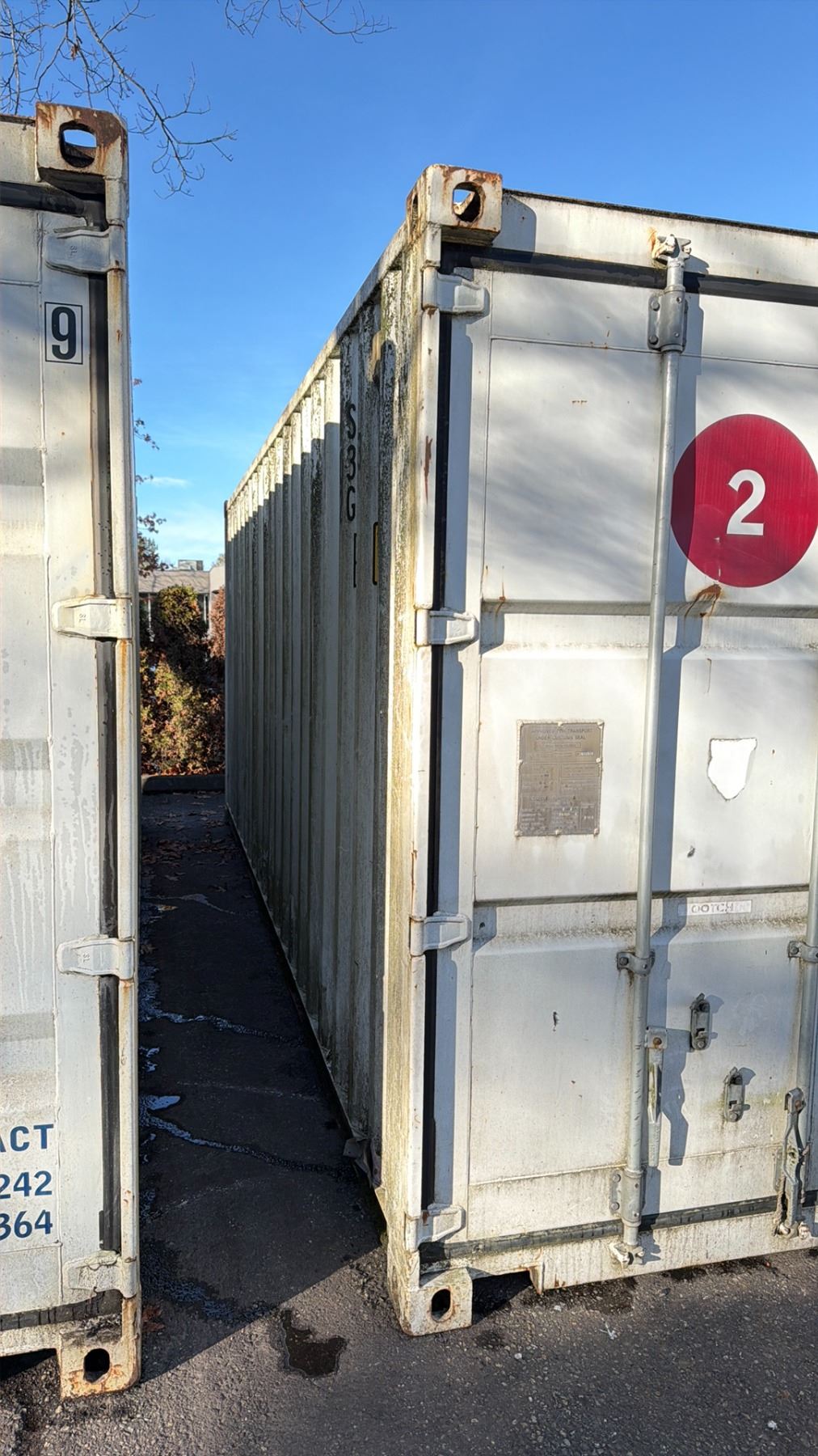 GREY 20' 67,200 MAX CAPACITY INDUSTRIAL TRANSPORT CONTAINER WITH DUAL SWING REAR DOORS WITH CAM LOCKS 20'L X 96"W X 102"H, CONTAINER #TTSU 203613 8 *REQUIRES HIAB CRANE OR TILT DECK TRAILER TO TRANSPORT*
