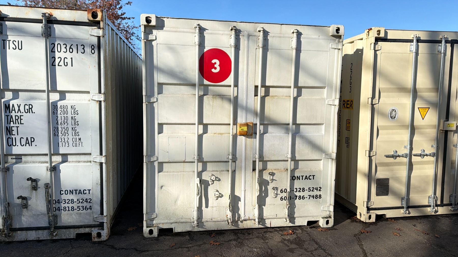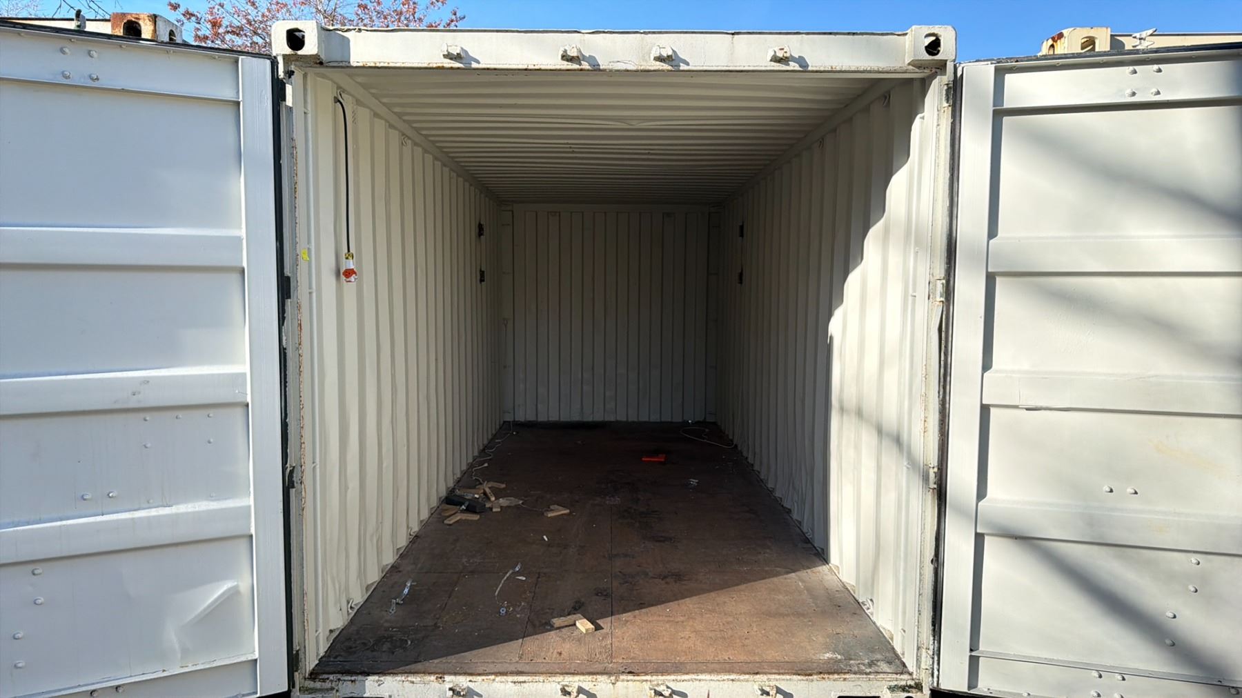 GREY 20' 67,200 MAX CAPACITY INDUSTRIAL TRANSPORT CONTAINER WITH DUAL SWING REAR DOORS WITH CAM LOCKS 20'L X 96"W X 102"H, NO CONTAINER # *HAS POWER CABLE FOR LIGHTING* *REQUIRES HIAB CRANE OR TILT DECK TRAILER TO TRANSPORT*