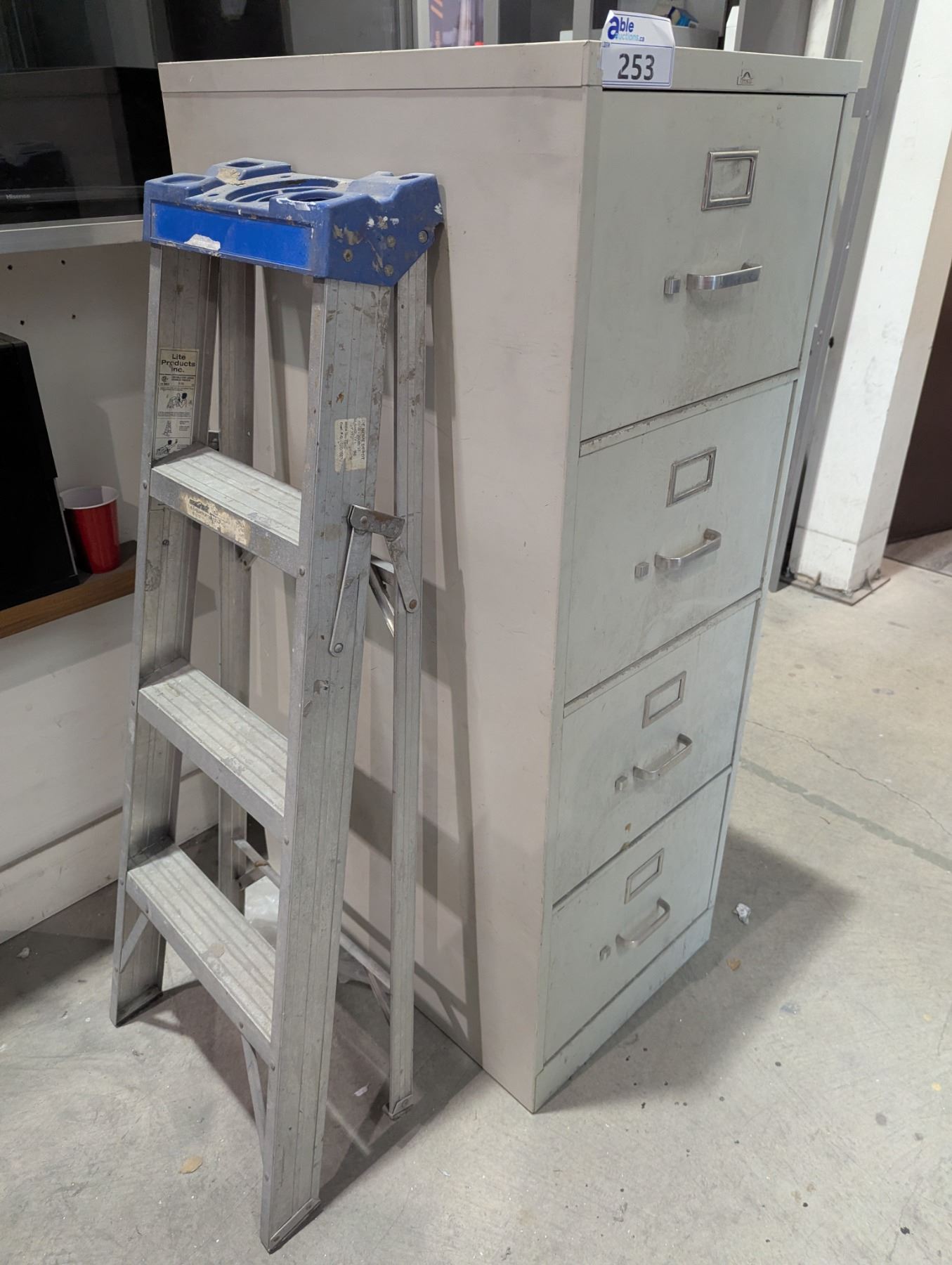 GREY 4 DRAWER FILING CABINET & 4' ALUMINUM LADDER