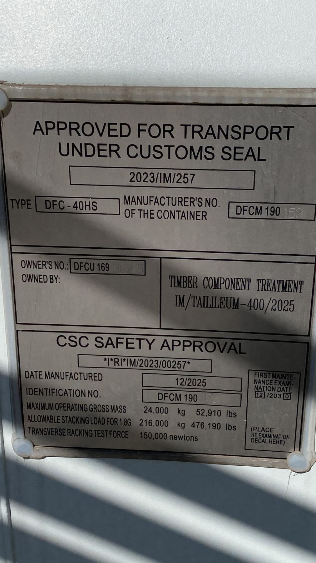 GREY 40' 52,910 LB MAX CAPACITY INDUSTRIAL TRANSPORT CONTAINER WITH 4 DUAL SWING SIDE DOORS DUAL SWING REAR DOOR WITH CAM LOCKS 40'L X 96"W X 114"H APPR CONTAINER # DFCU1693025 *REQUIRES HIAB CRANE OR TILT DECK TRAILER TO TRANSPORT* *LAST DAY FOR REMOVAL - SAT APR 18*