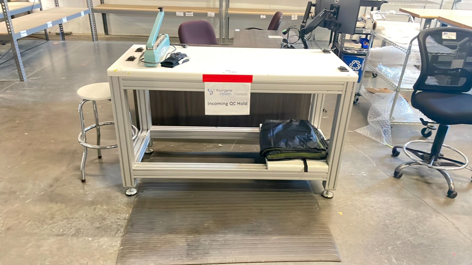 GREY 59"W X 26"D X 37"H HEAT SEALING TABLE WITH A ULINE 8" IMPULSE SEALER & A WHITE STOOL