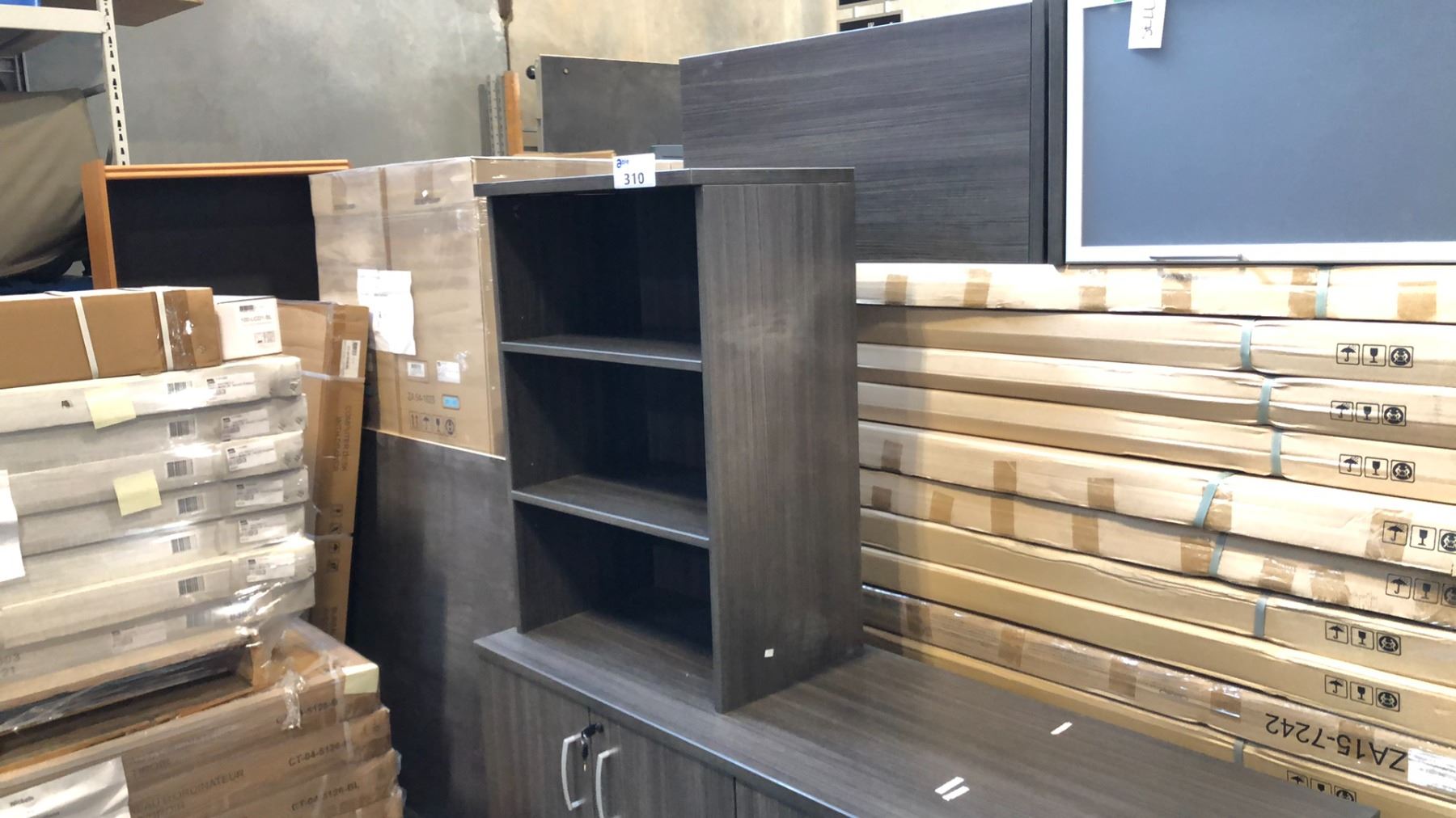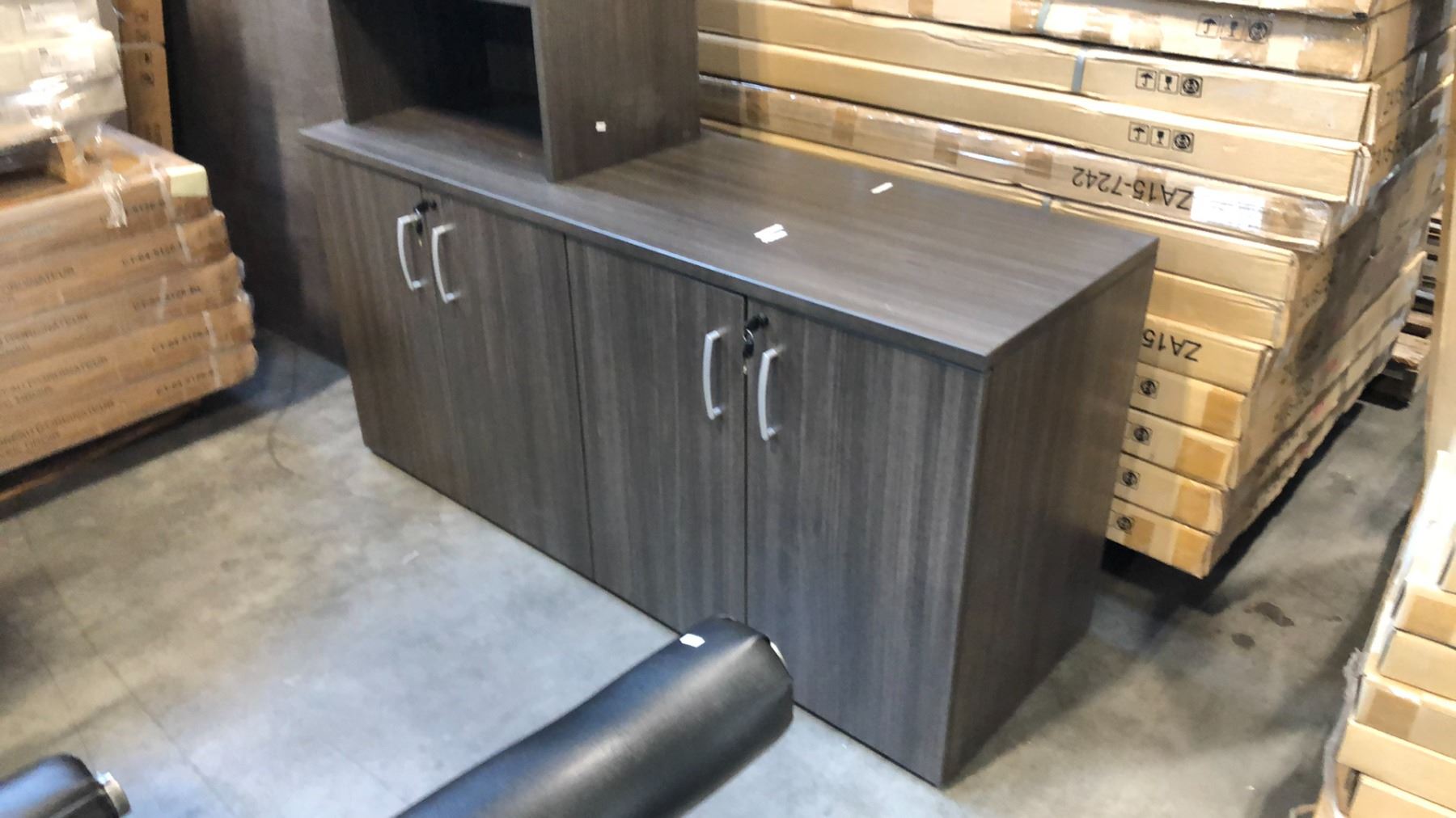 GREY 60" X 20" CREDENZA, HUTCH AND 2 OVER HEAD STORAGE UNITS