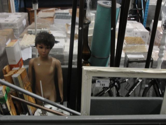 GREY BIN FILLED WITH ASSORTED FLOOR LAMPS, CHILD MANNEQUIN, WINDOW BLINDS, MIRROR, ETC