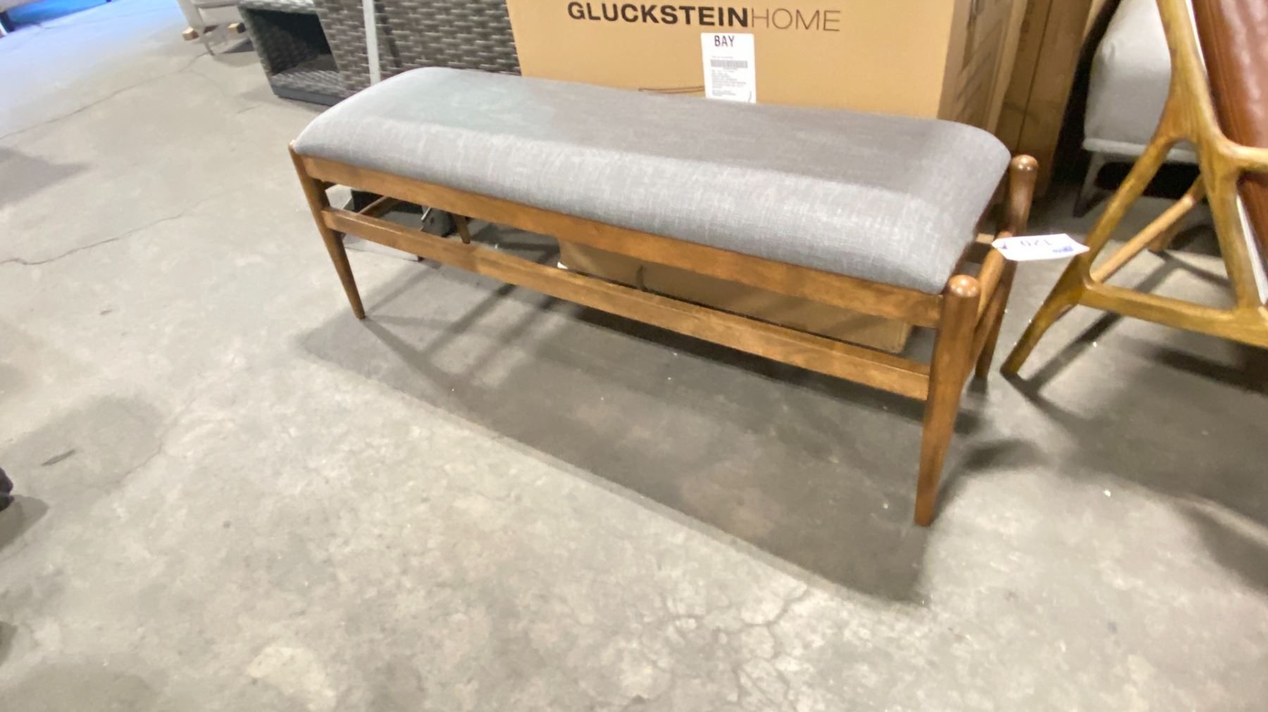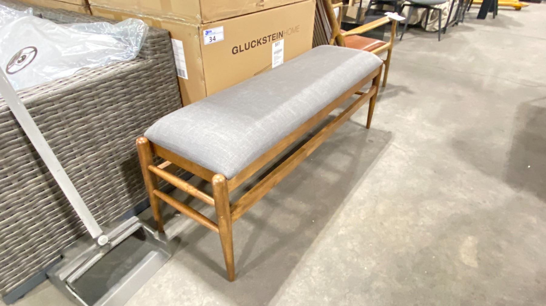 GREY FABRIC PADDED TOP WOOD FRAMED DESIGNER HALL BENCH 54"W X 16"D X 20"H