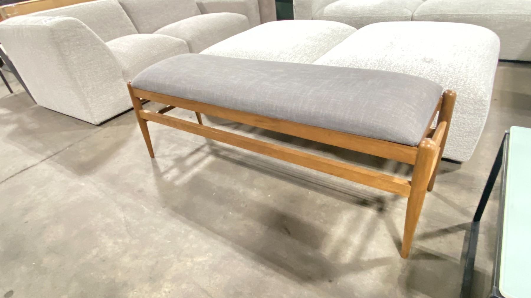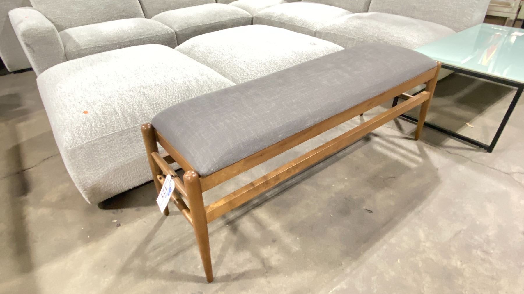 GREY FABRIC PADDED TOP WOOD FRAMED DESIGNER HALL BENCH 54"W X 16"D X 20"H