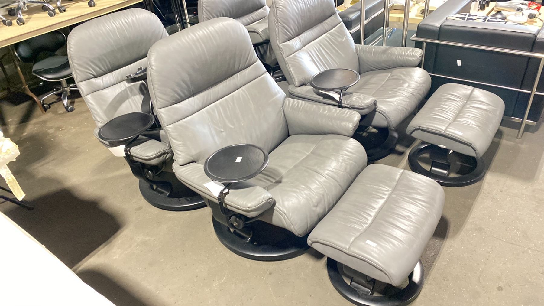 GREY LEATHER LOOK RECLINING PROFESSIONAL SPA CLIENT SWIVEL CHAIR WITH OTTOMAN & HAND TABLE