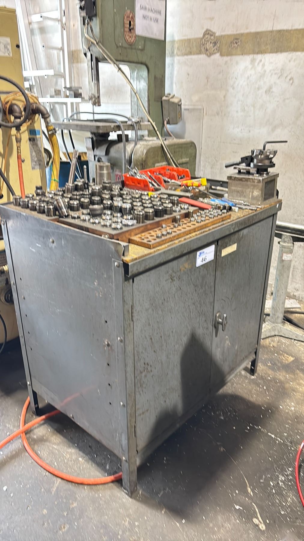 GREY METAL 2 DOOR COMMERCIAL TOOLING WORK CENTER WITH ASSORTED INDUSTRIAL CNC MACHINE TOOLING