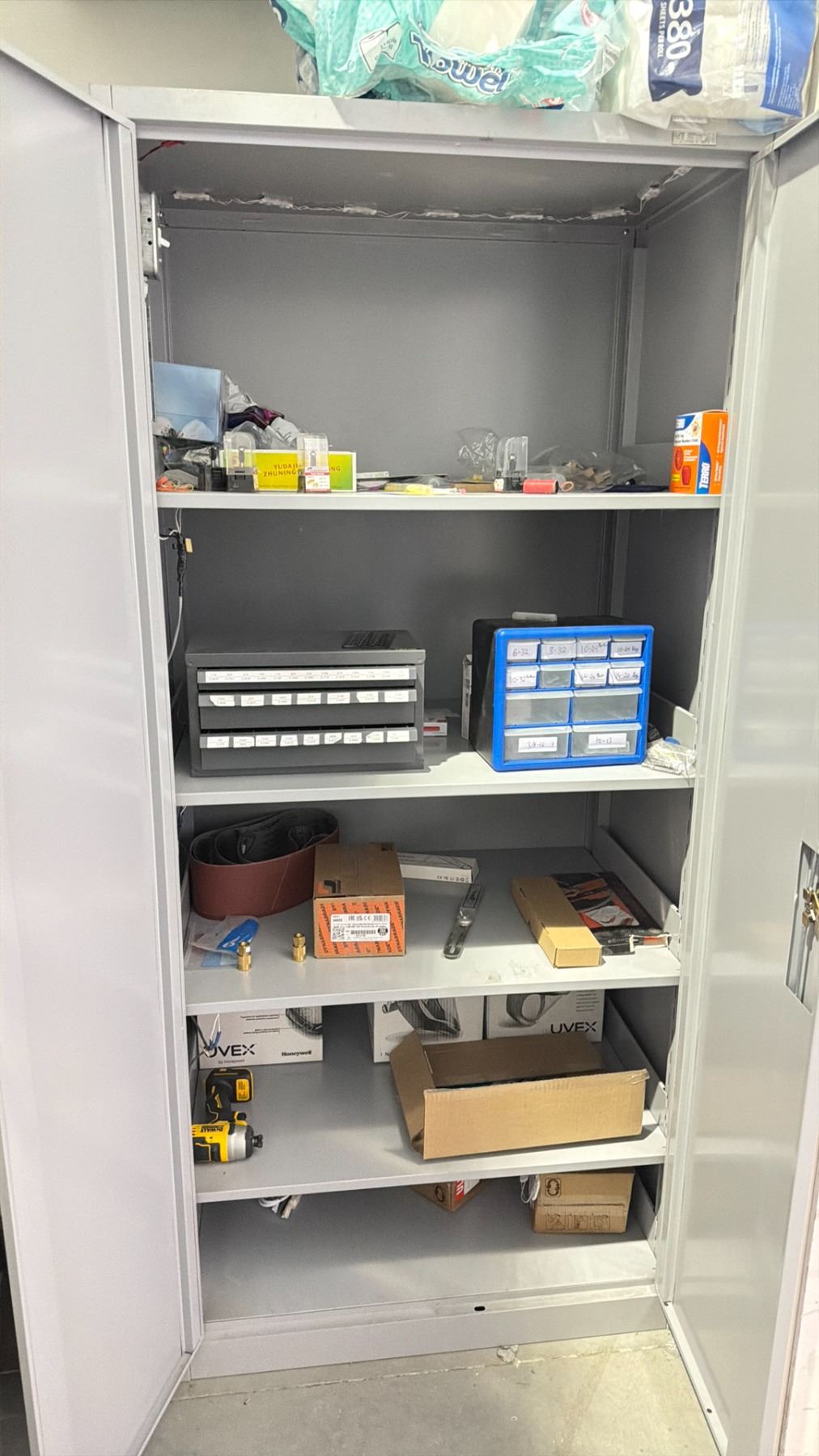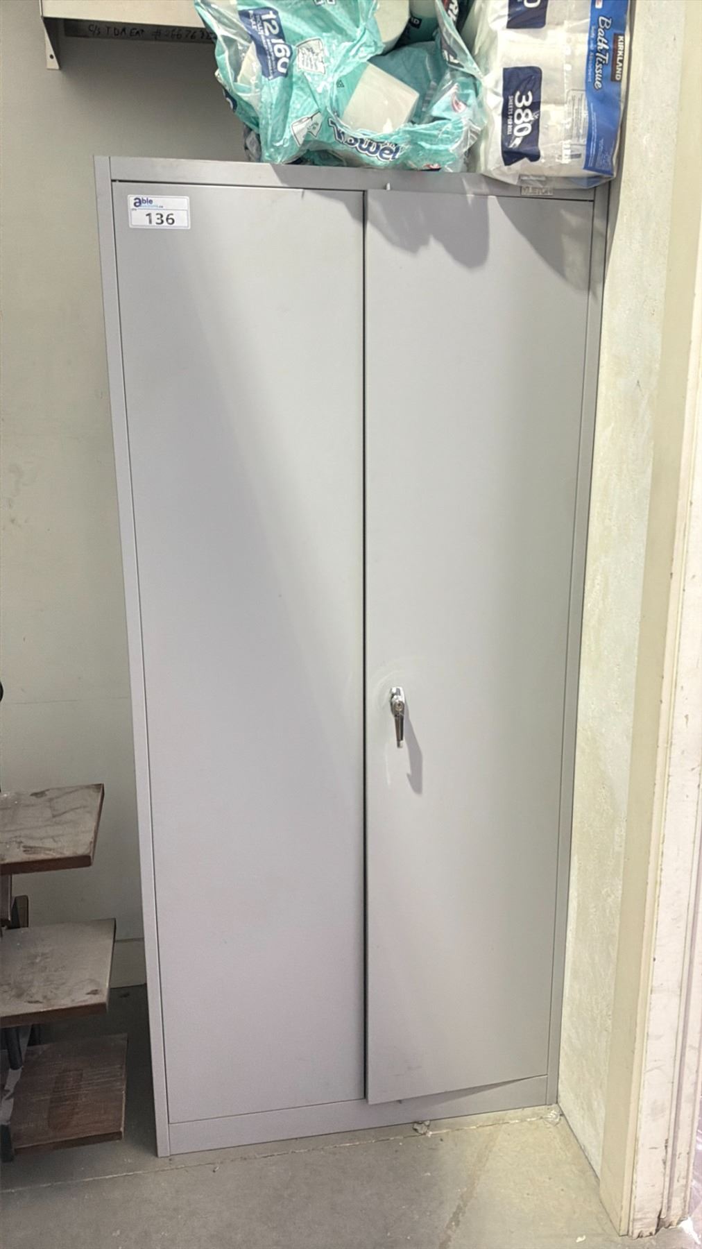 GREY METAL 2 DOOR CONSUMABLES CABINET WITH ASSORTED SHOP CONTENTS