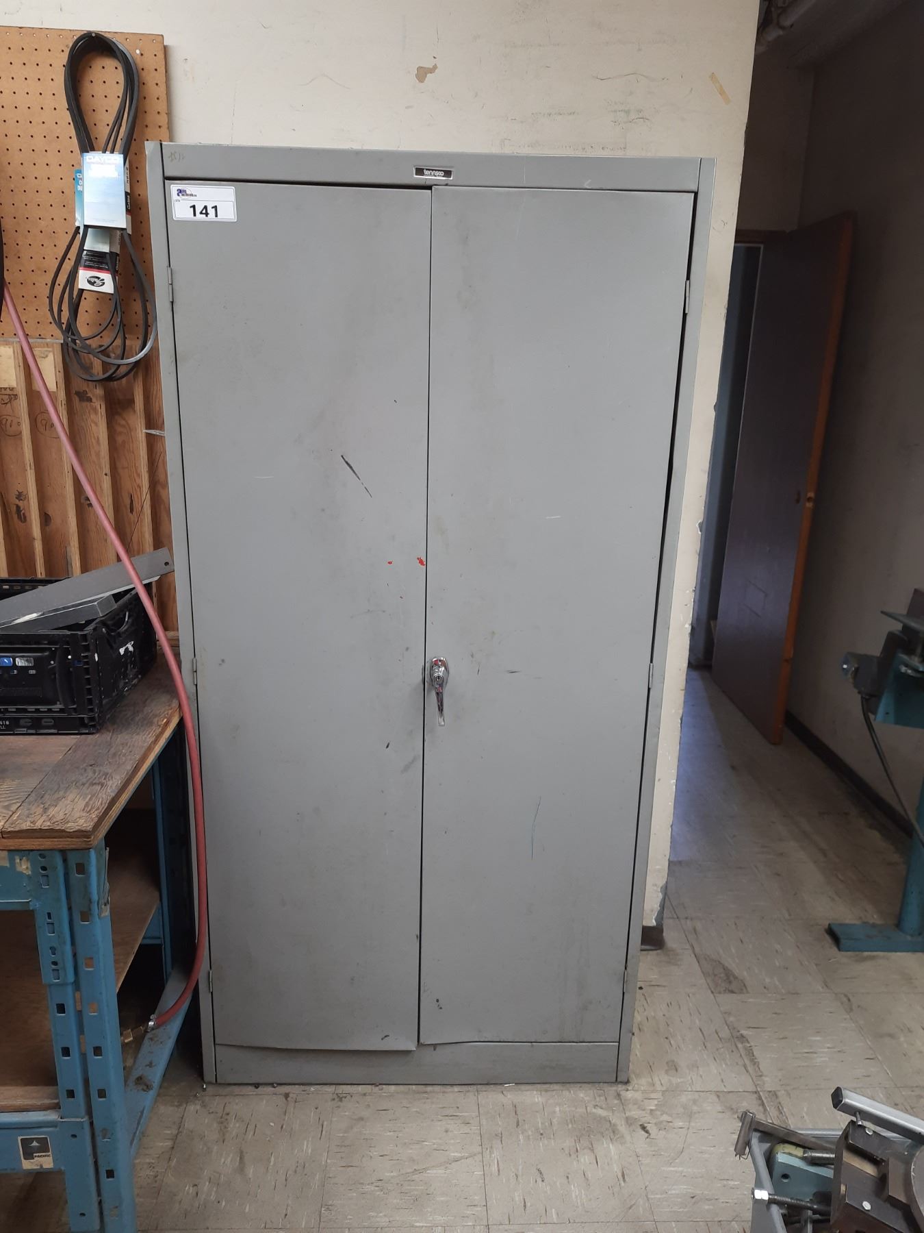 GREY METAL 2 DOOR STORAGE CABINET AND REMAINING CONTENTS