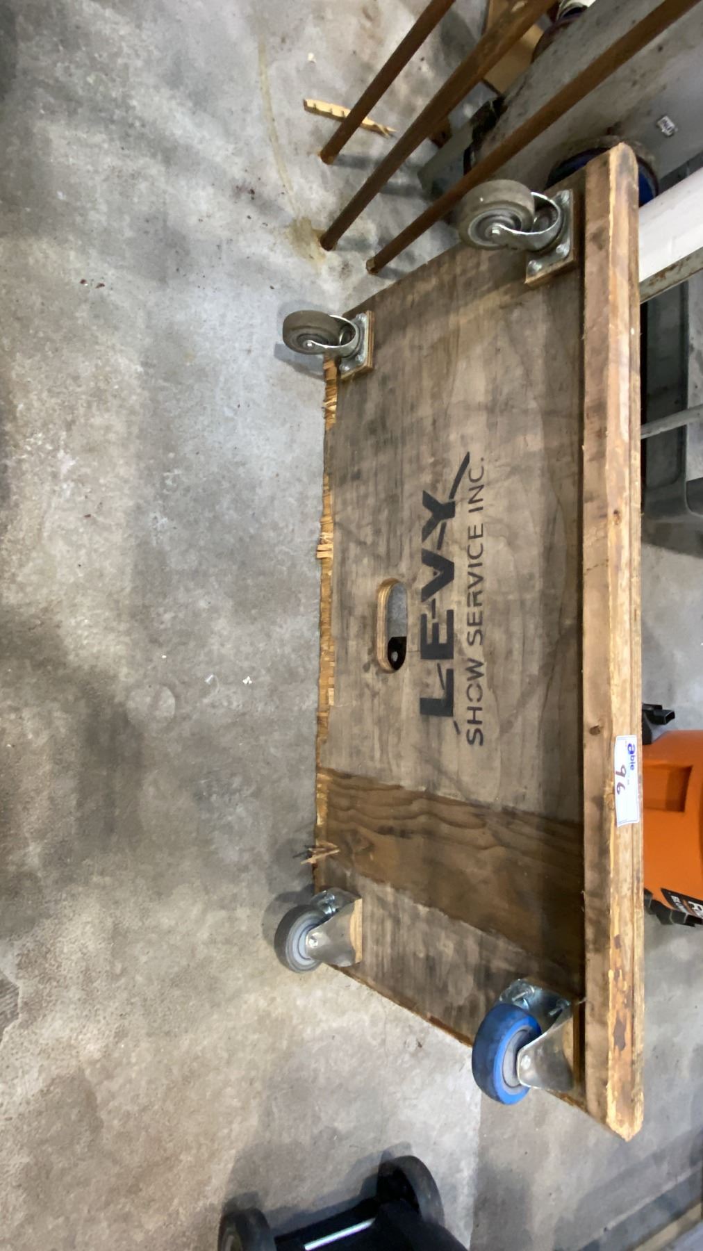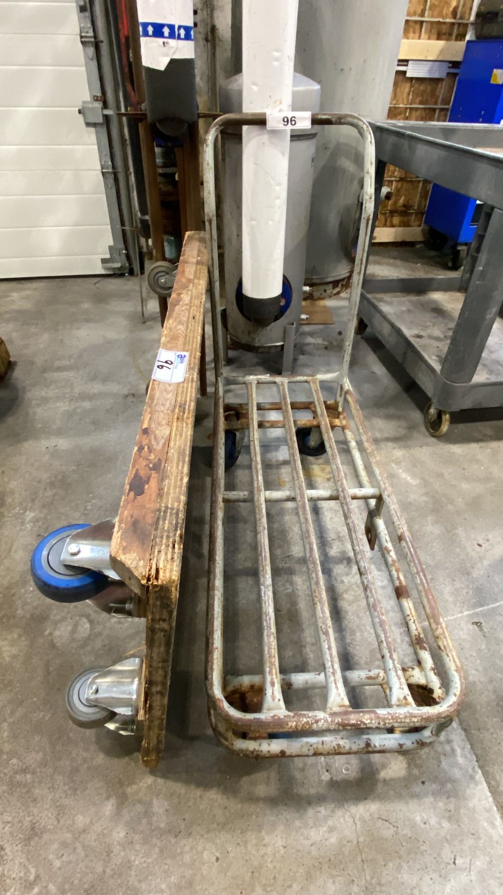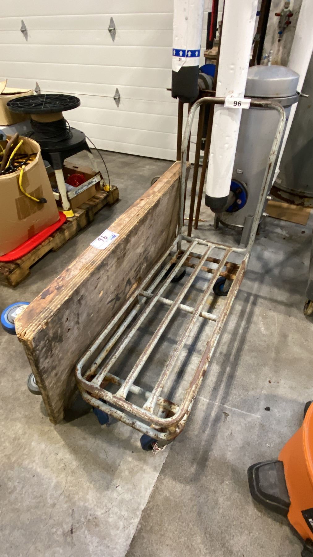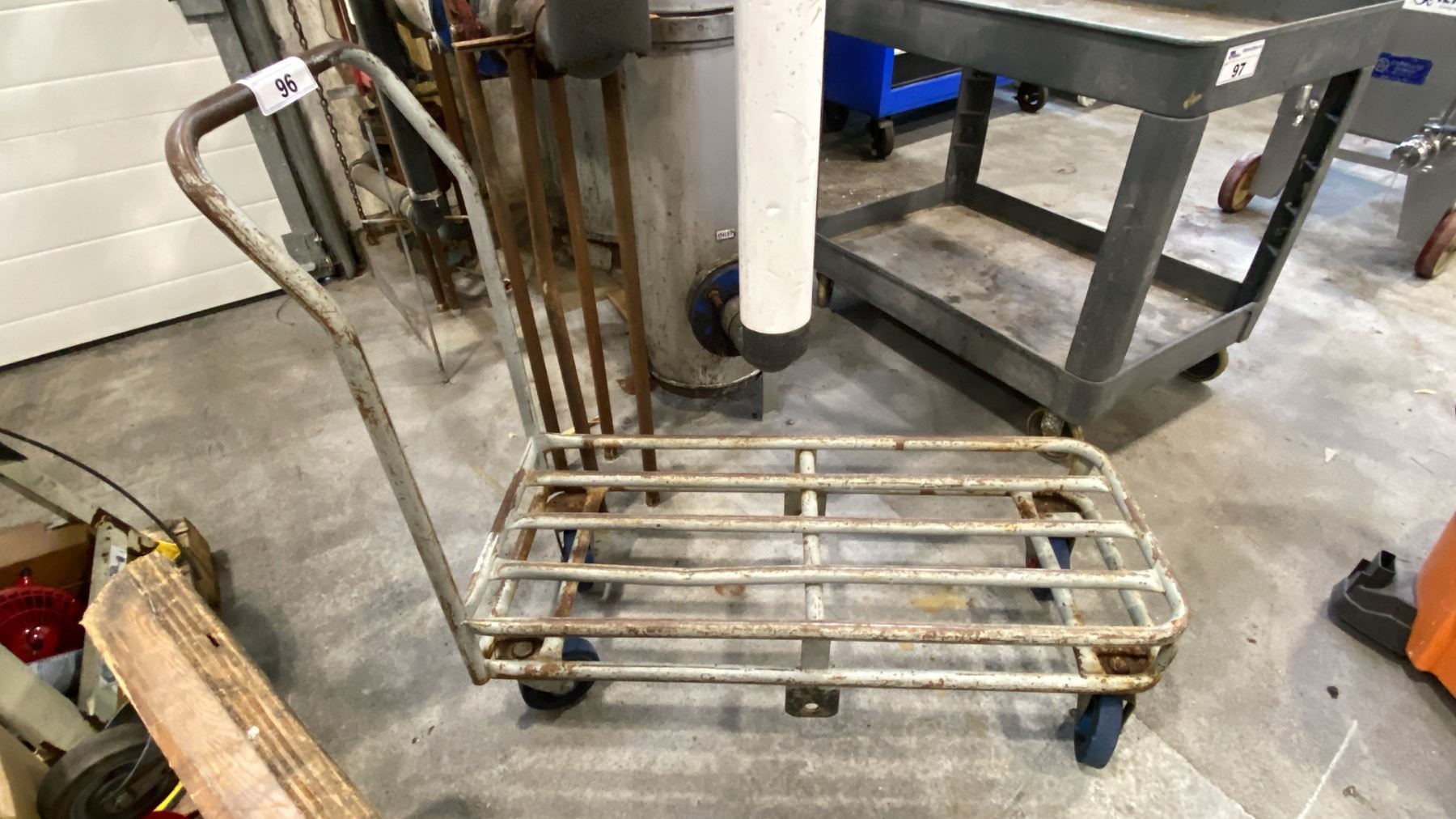 GREY METAL 4 WHEEL MATERIAL CART AND WOODEN 4 WHEEL PLATFORM DOLLY