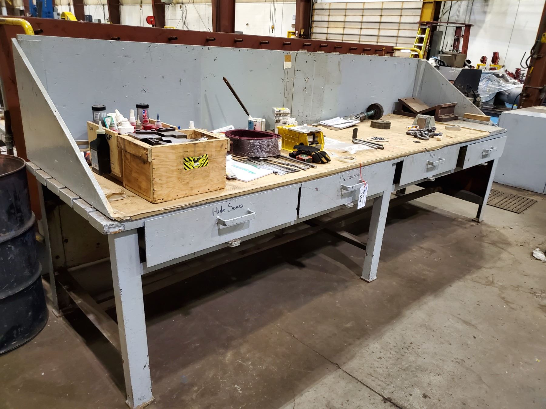 GREY METAL AND WOOD WORKBENCH WITH 4 DRAWERS 147"L X 37"W X 57"H CONTENTS NOT INCLUDED
