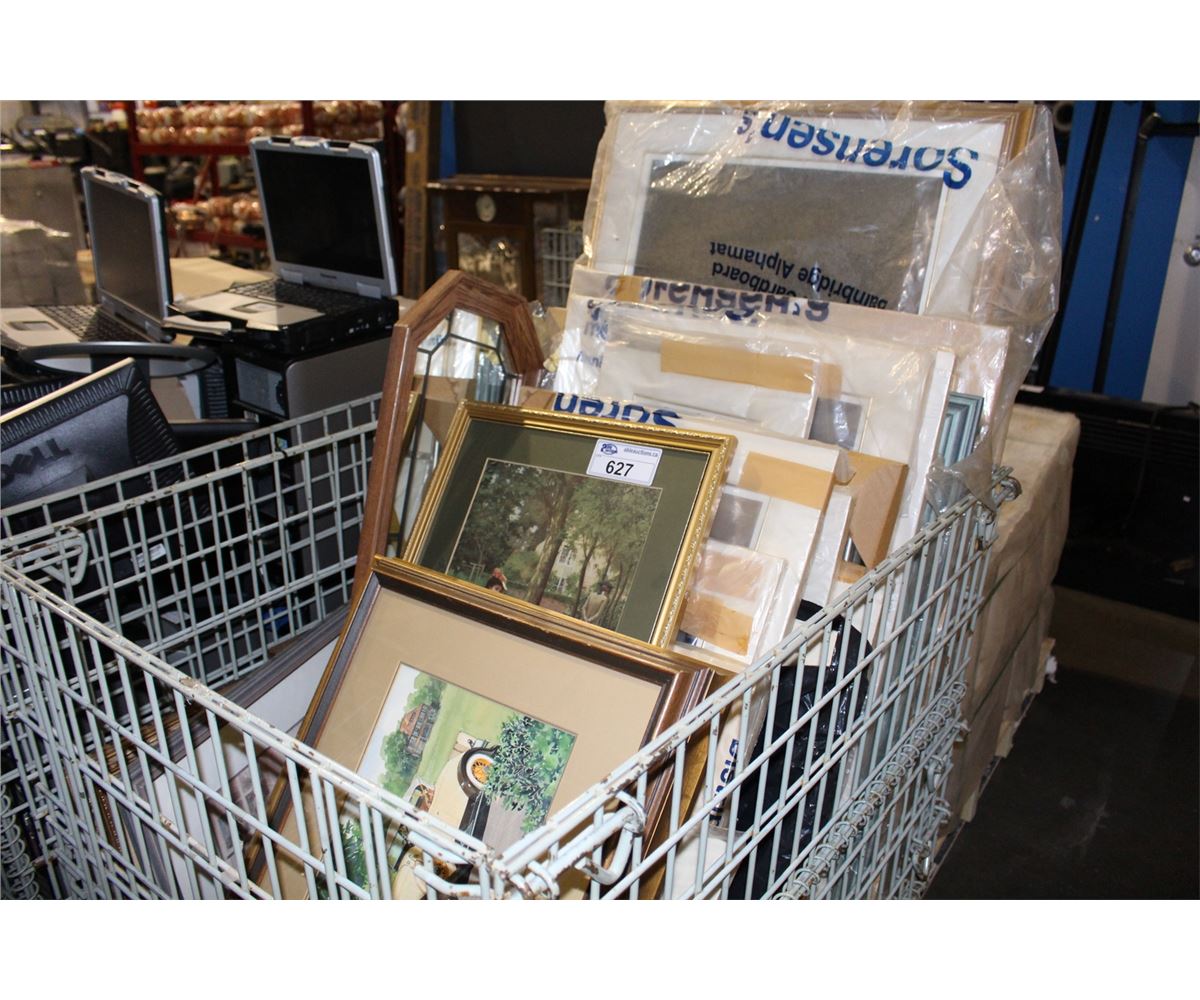 GREY METAL BIN FILLED WITH ASSORTED FRAMED PICTURES, PRINTS,PICTURE FRAMES, ETC *GREY ROLLING BIN NOT INLCUDED*