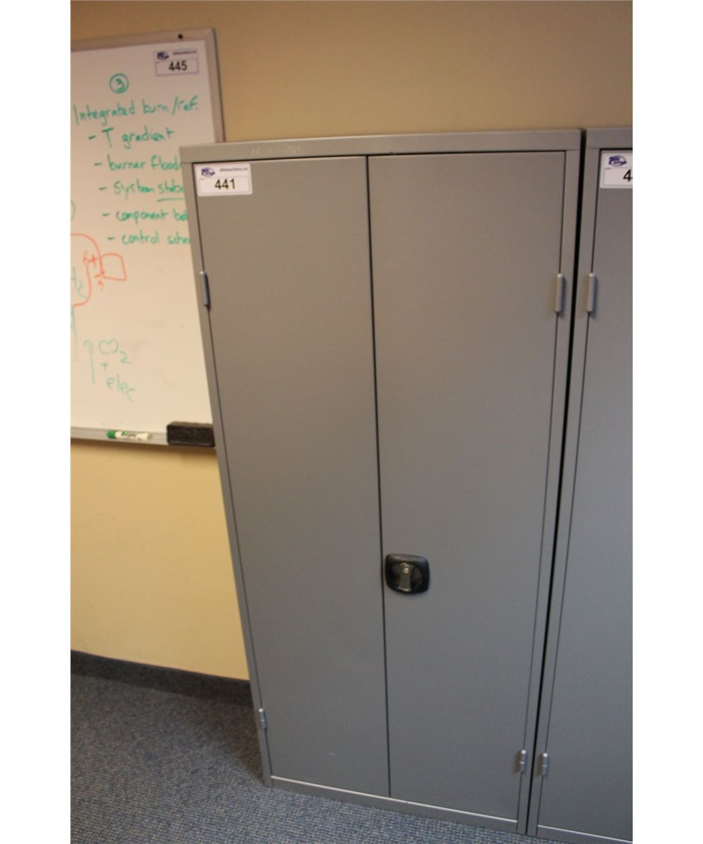 GREY METAL CABINET WITH CONTENTS