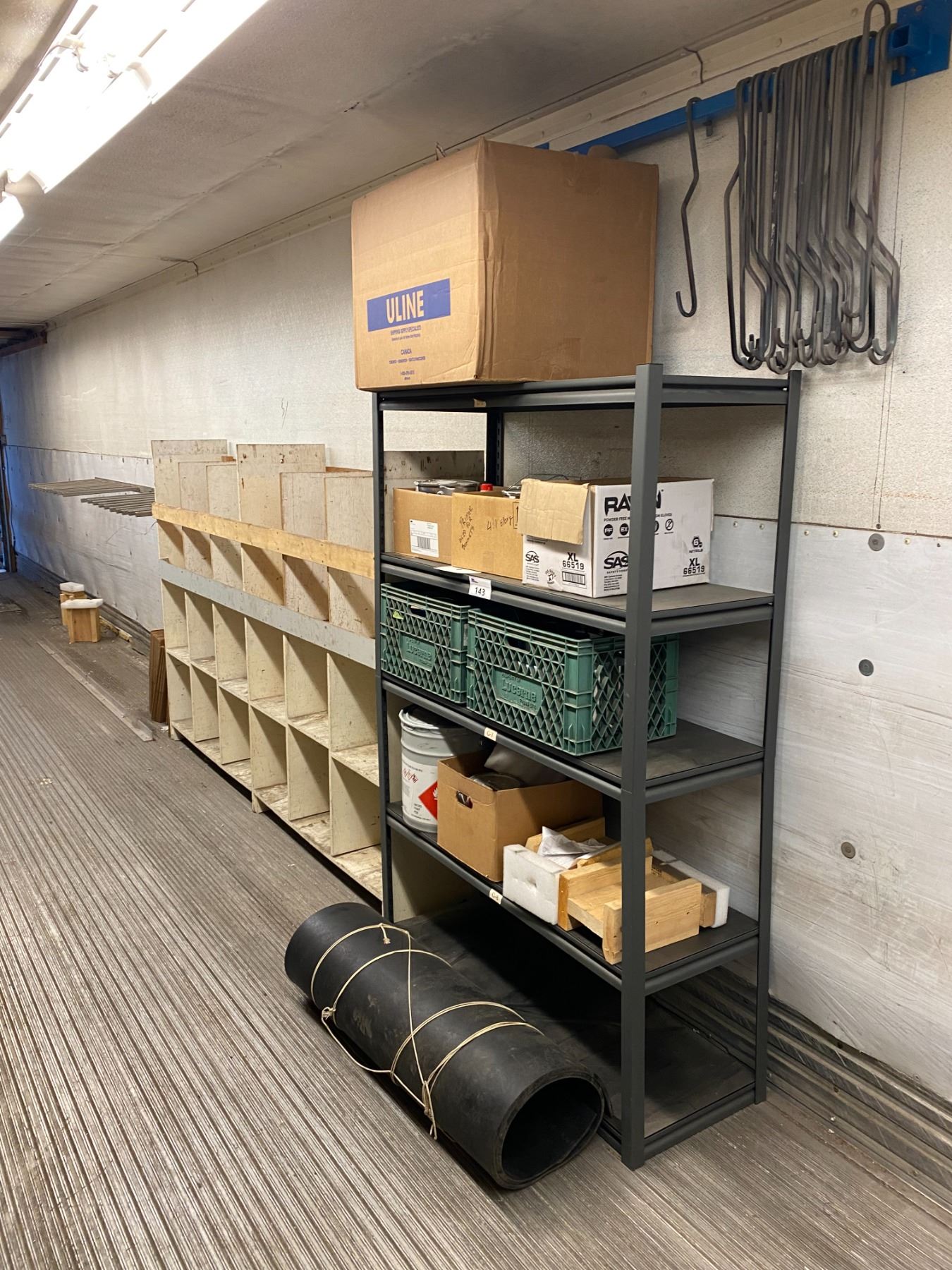 GREY METAL PRODUCT RACK WITH REMINING CONTENTS AND WALL MOUNTED VERTICAL PRODUCT RACK
