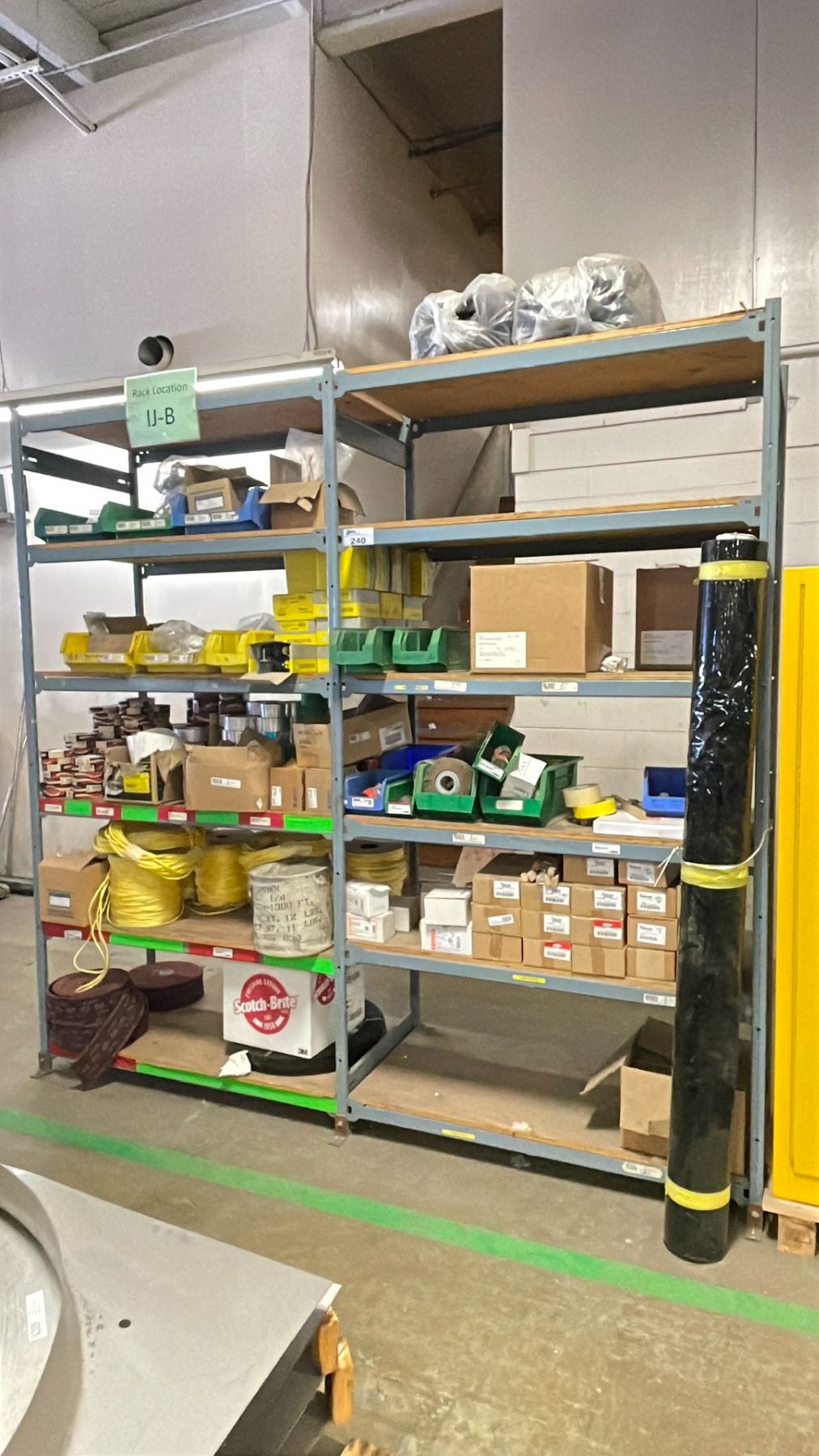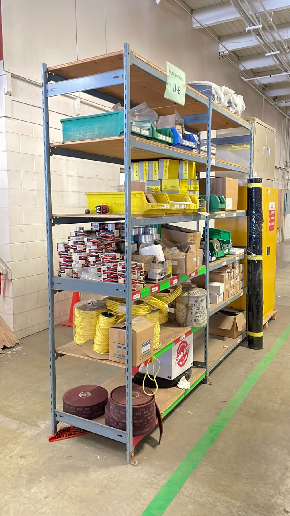 GREY METAL SHELF RACKING SYSTEM - APPROX.100" ACROSS X 25" WIDE X 96" HIGH **CONTENTS NOT INCLUDED, MON REMOVAL ONLY**