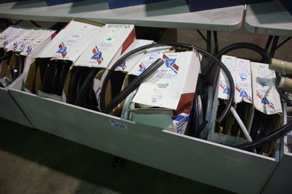 GREY MOBILE BIN OF MARINE PARTS AND HOSE