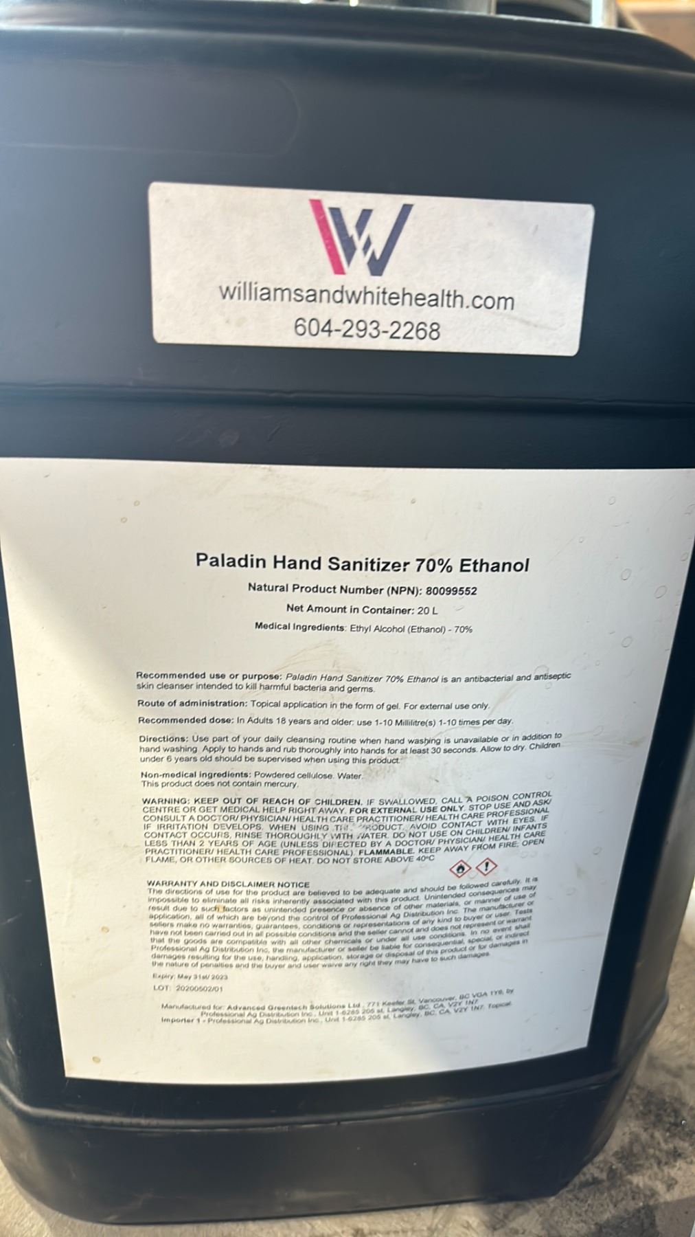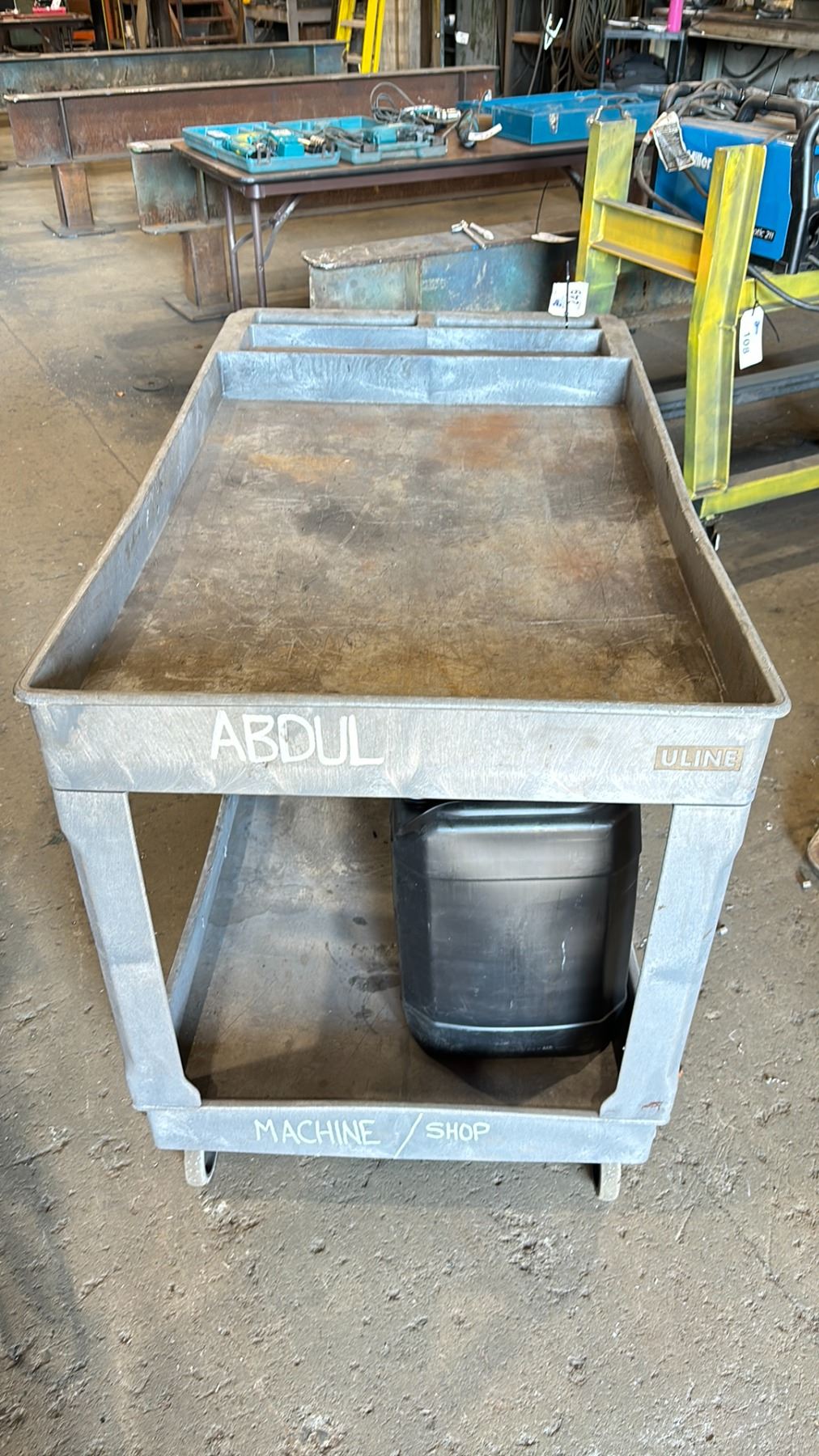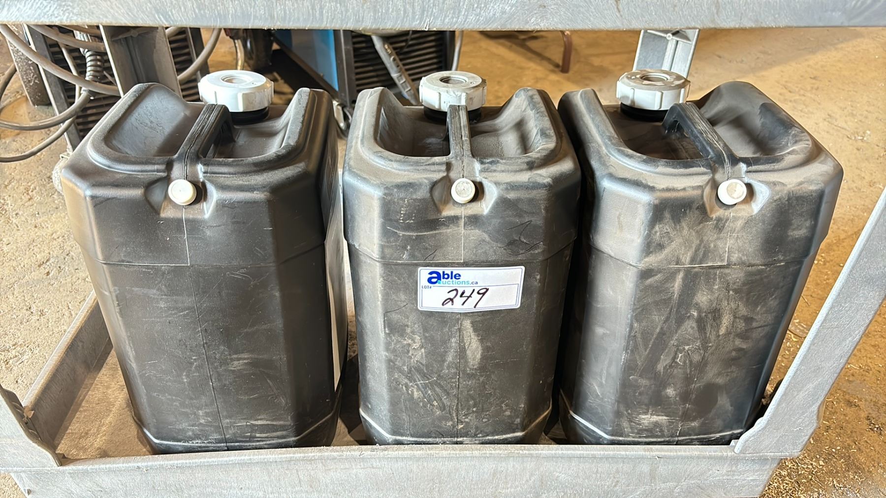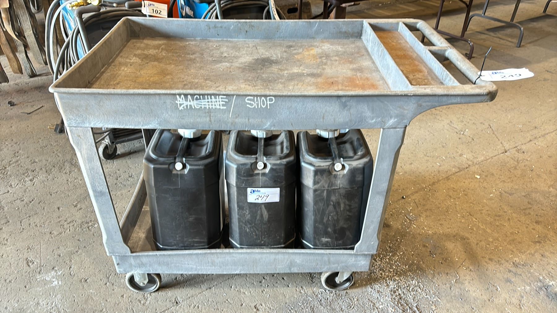 GREY MOBILE WORK CART WITH 3 LARGE CONTAINERS OF HAND SANITIZER (70% ETHANOL)