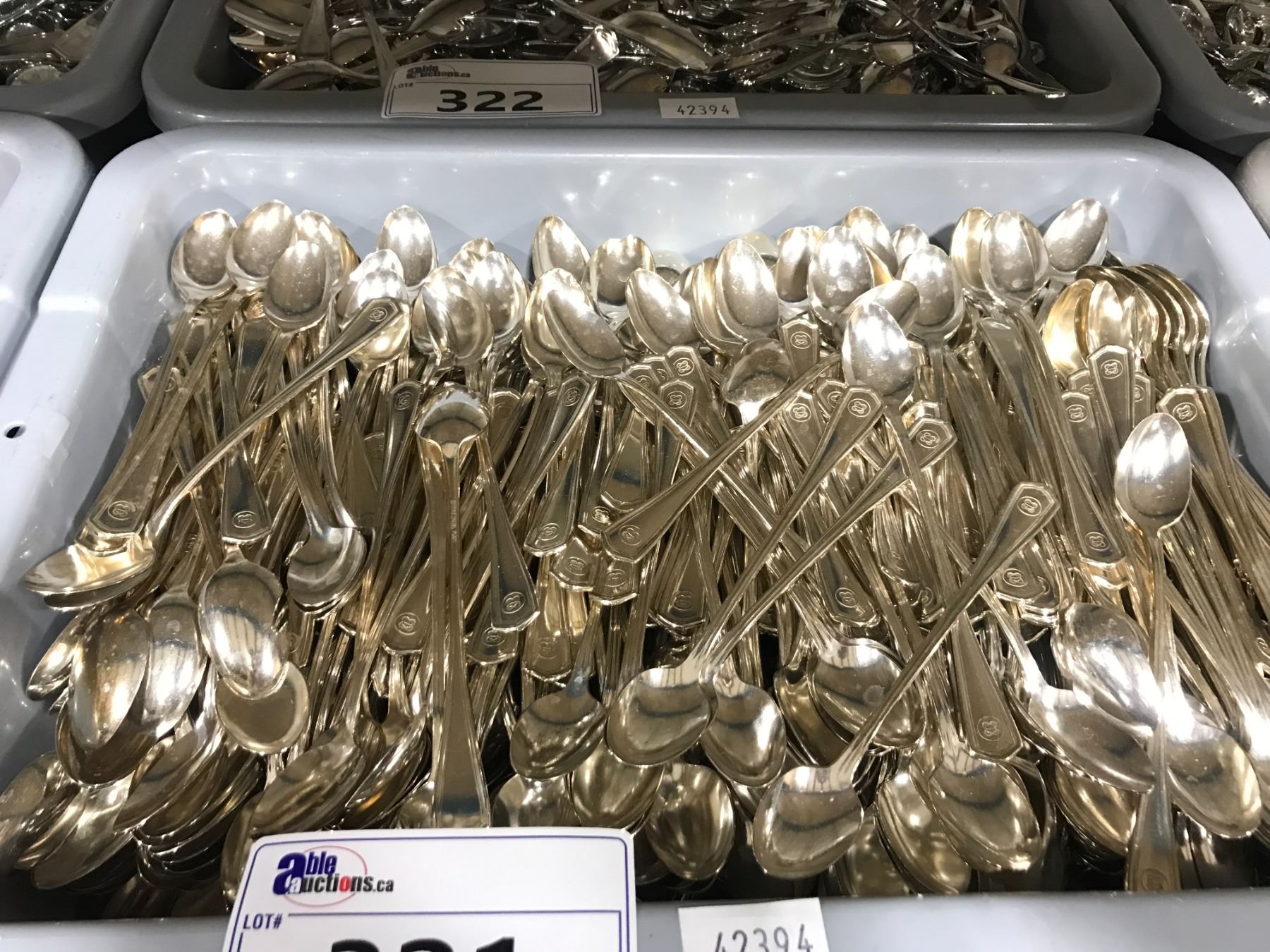 GREY PLASTIC TRAY OF COMMERCIAL GRADE DINNER SPOONS