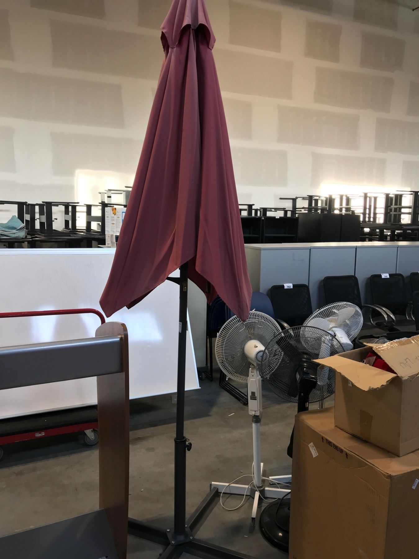 GREY/RED PATIO UMBRELLA (CONDITION ISSUES)