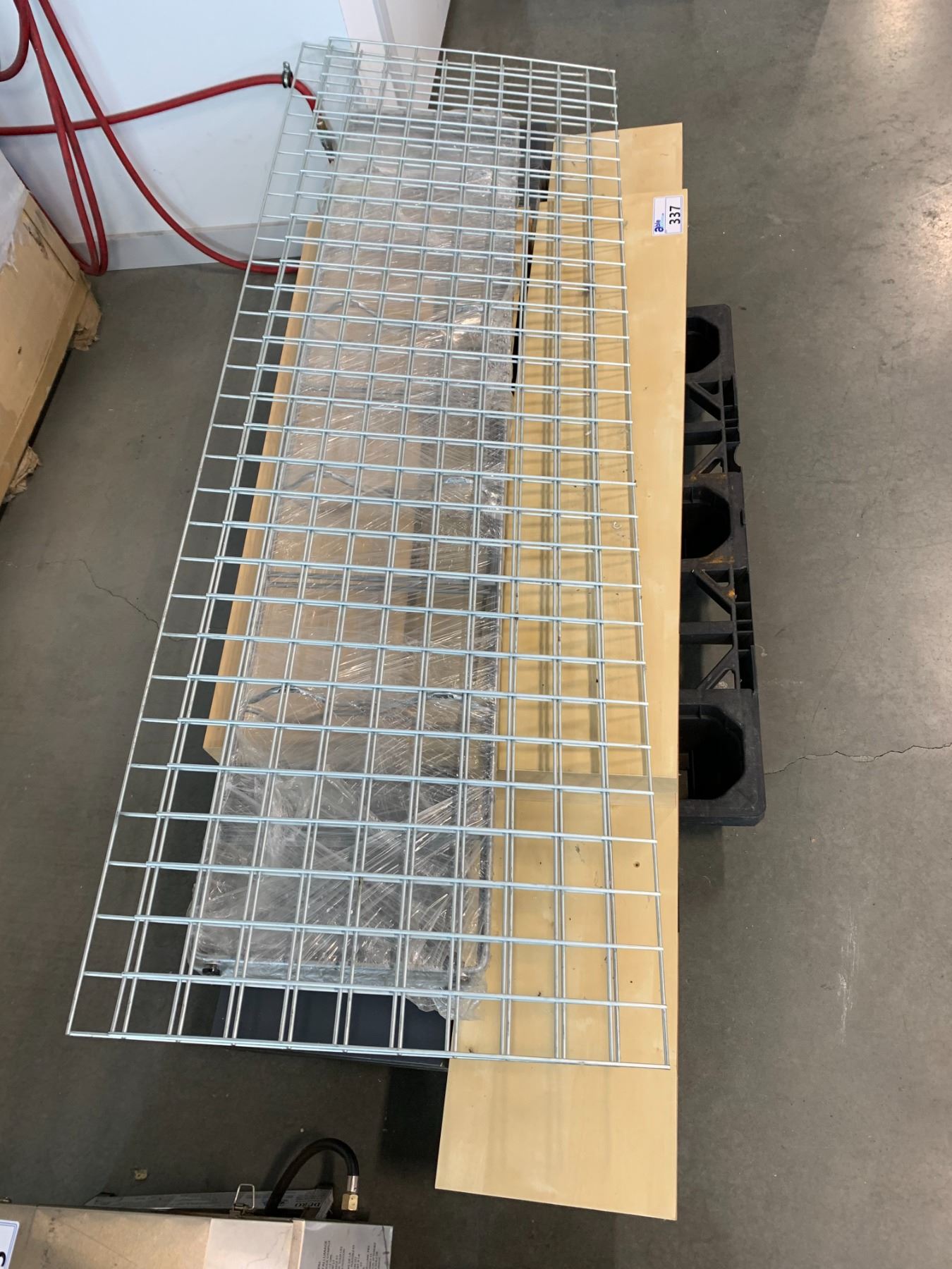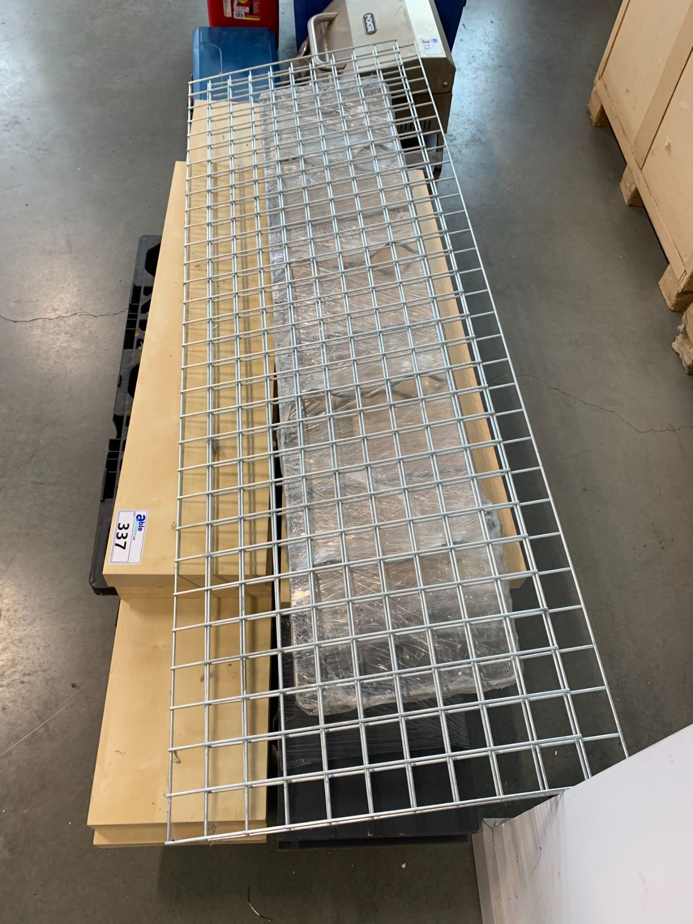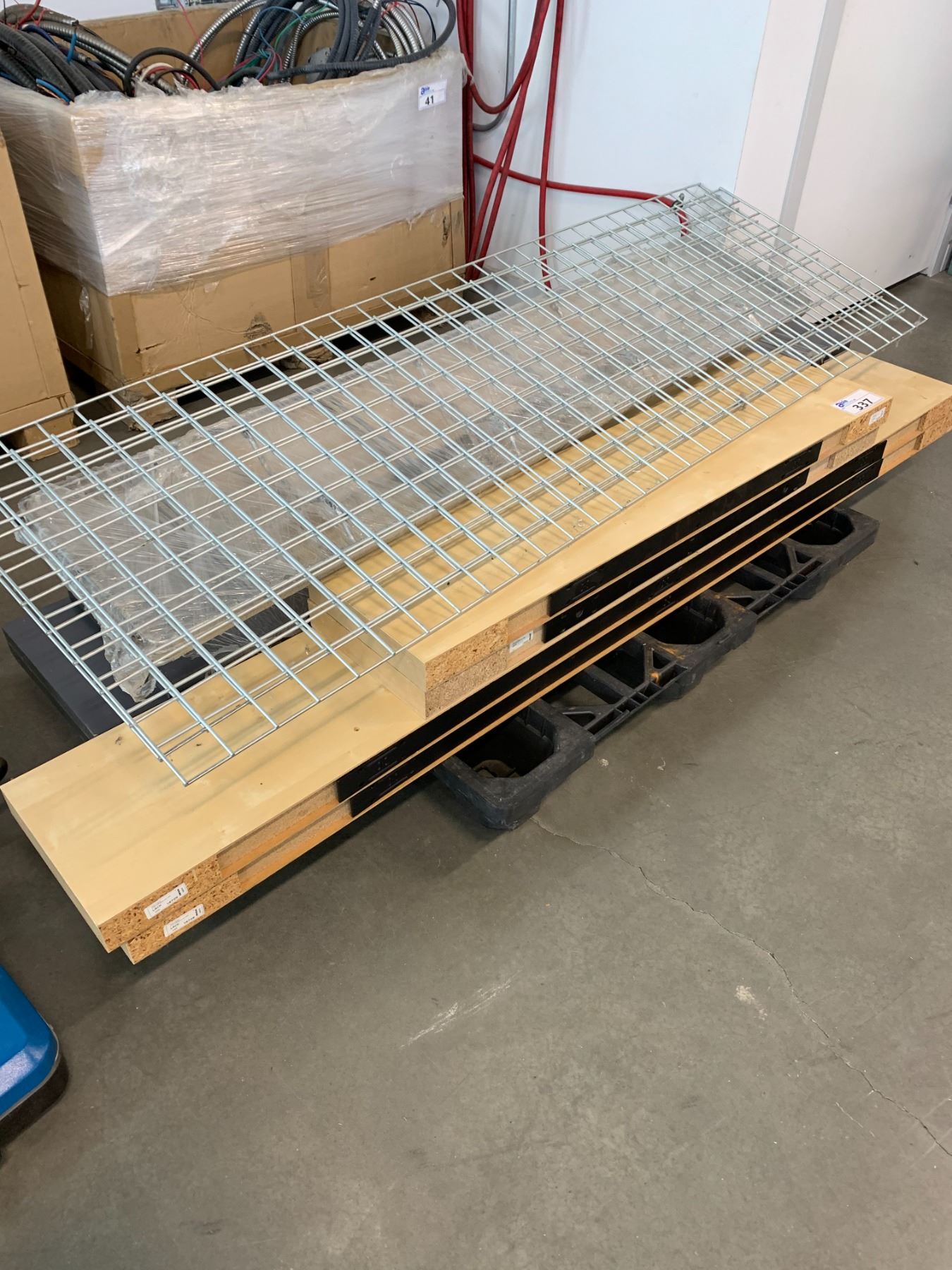 GREY SHELVING UNIT AND IKEA NATURAL FINISH SHELF UNIT (DISASSEMBLED ON PALLET)