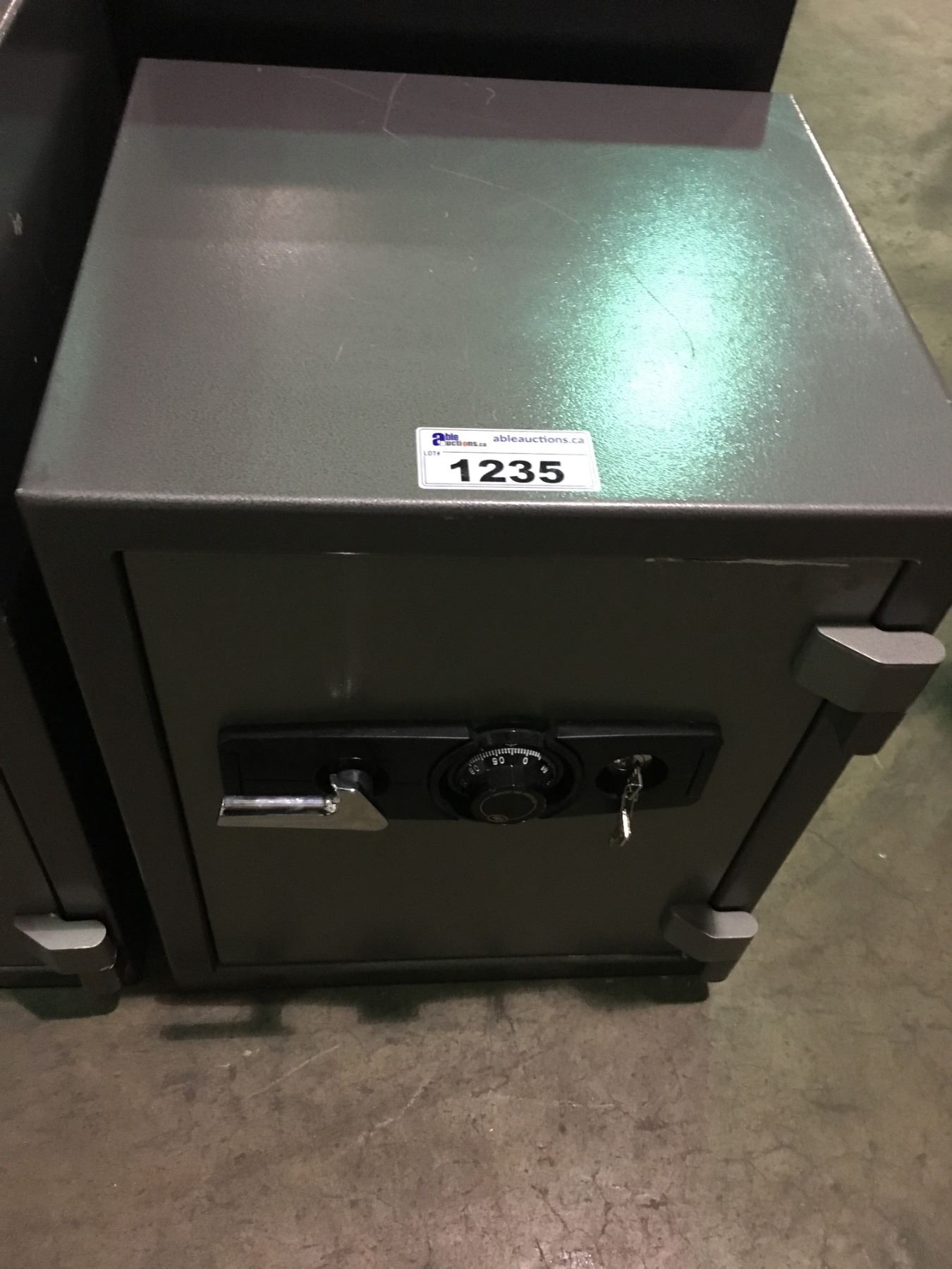 GREY SINGLE DOOR 26" X 22" X 20" FIRE RESISTANT COMBINATION / KEY SAFE ( COMBINATION 4 TIMES LEFT TO 50, RIGHT TO STOP )