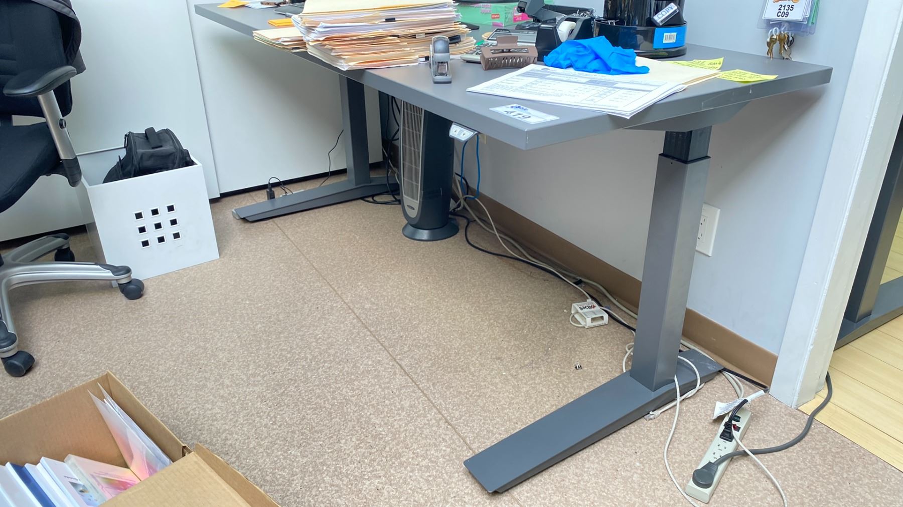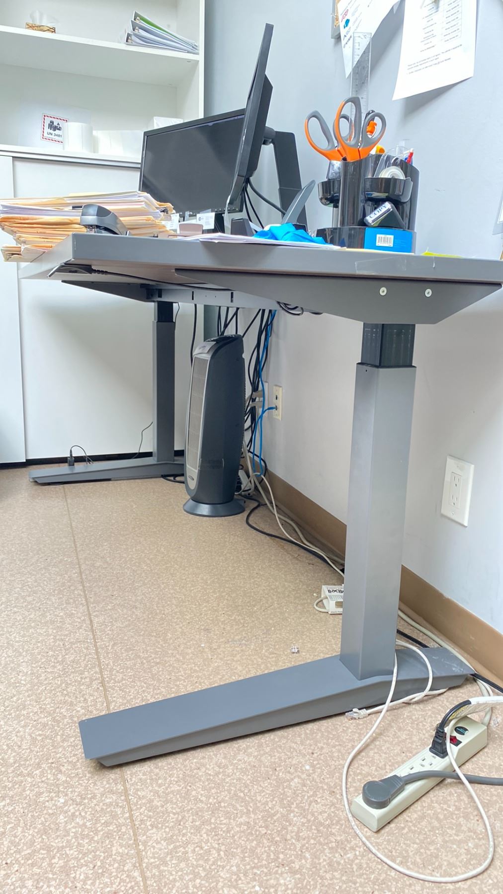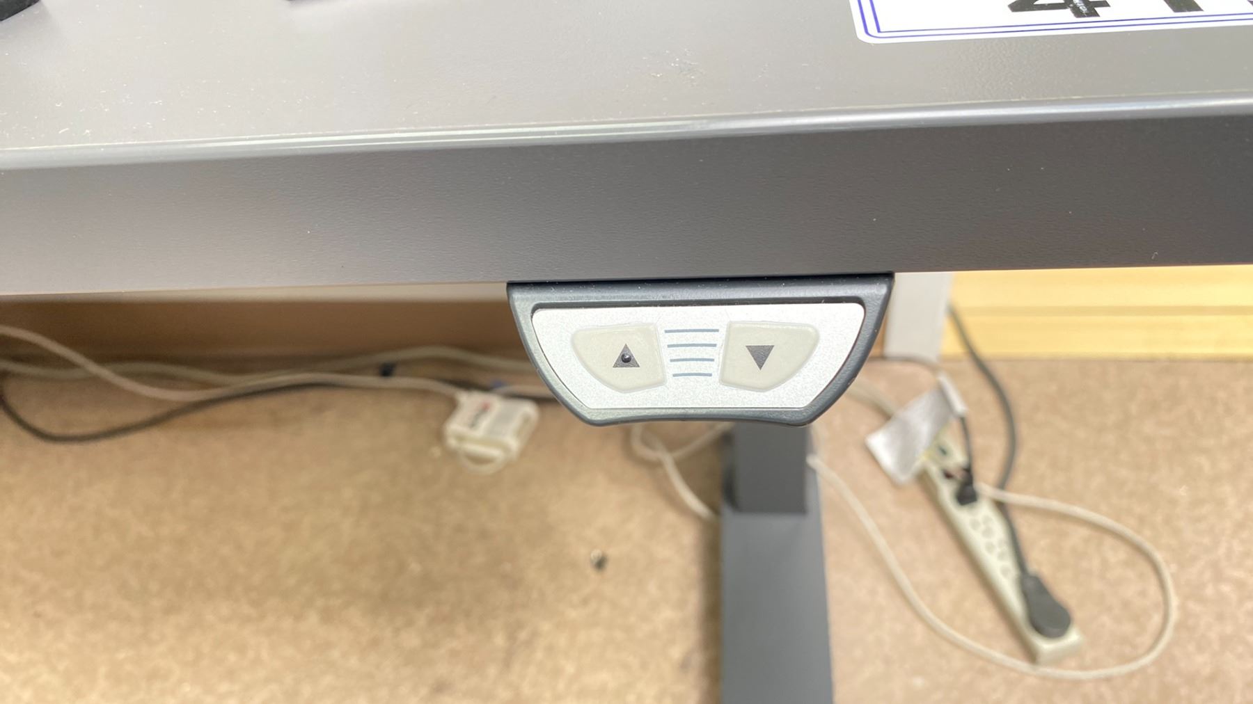 GREY SIT TO STAND ELECTRIC DESK APPROX 5' X 2.5' (CONTENTS NOT INCLUDED)
