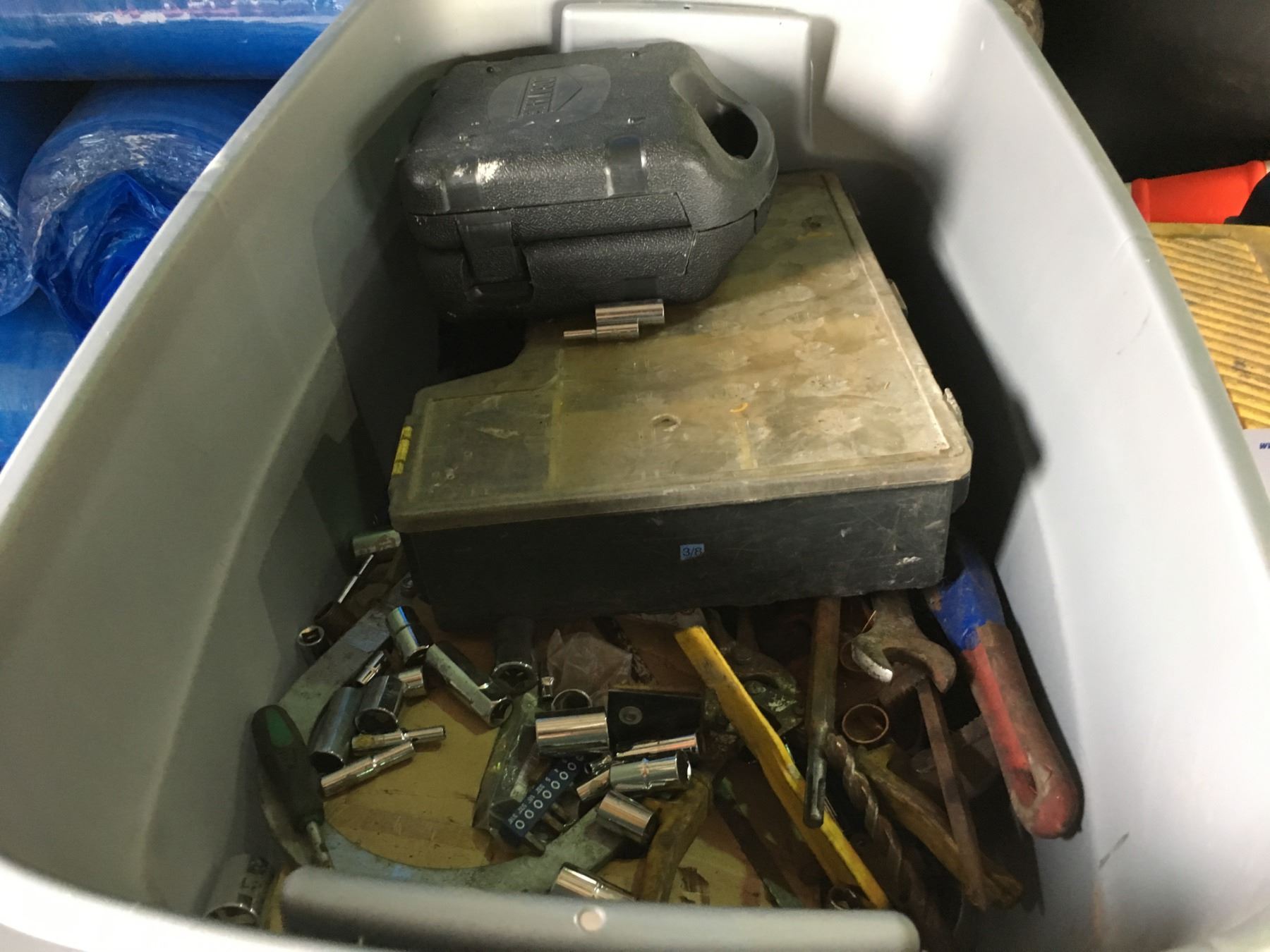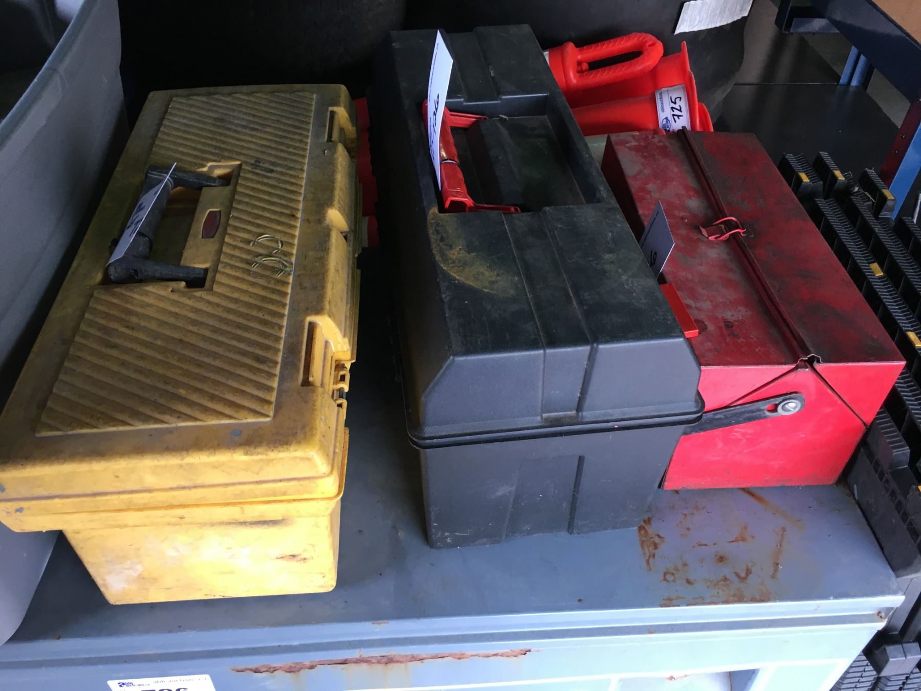 GREY SUPERIOR JOB SITE TOOL BOX WITH PLASTIC SAW HORSES, 3 TOOL BOXES WITH CONTENTS & BIN OF ASSORTED TOOLS & HARDWARE