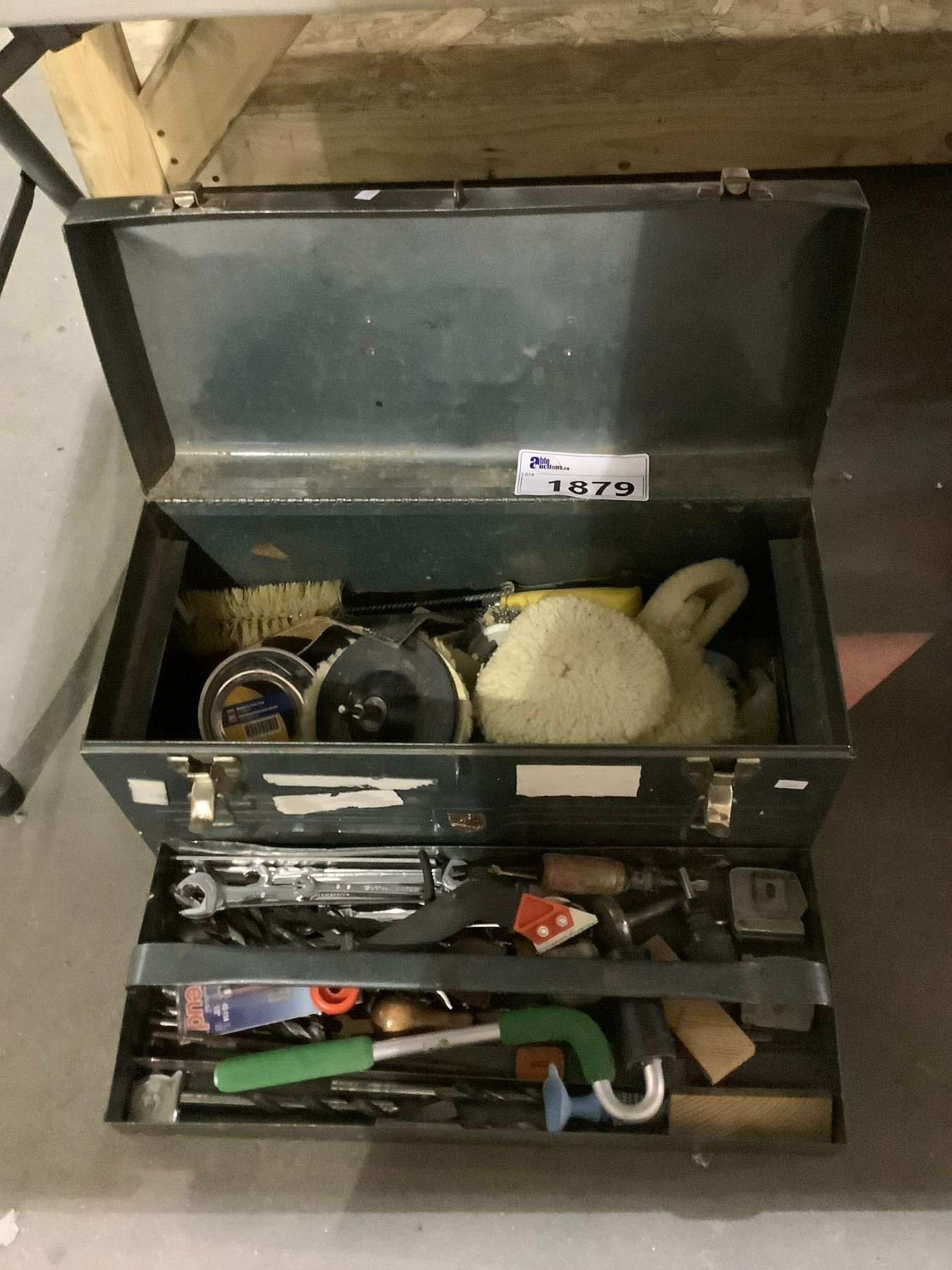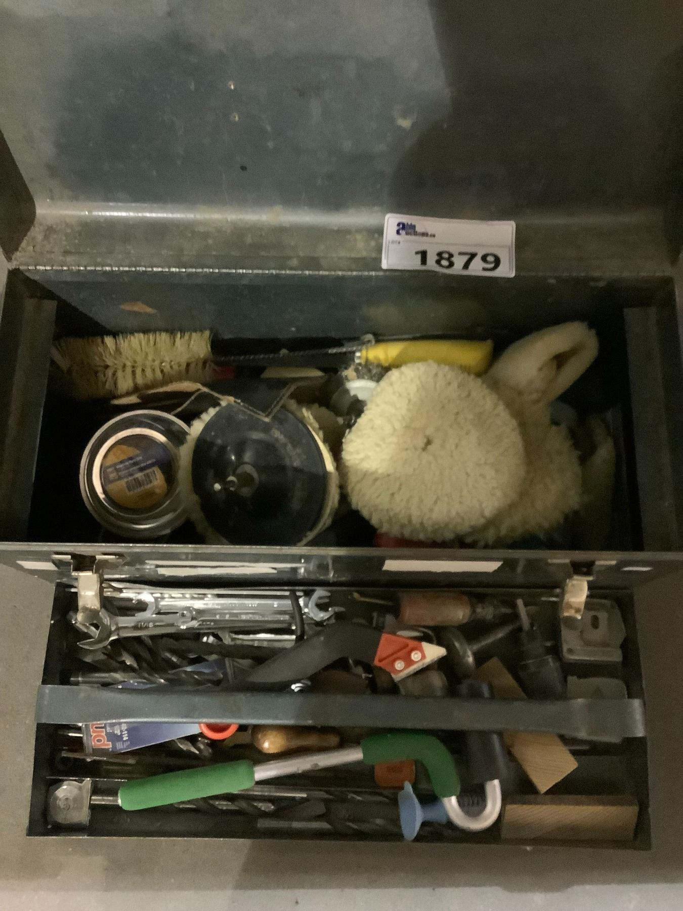 GREY TOOLBOX WITH CONTENTS INCLUDING; WAXING PADS, PAINT ROLLER, MAGNETIC PARTS TRAY & MORE