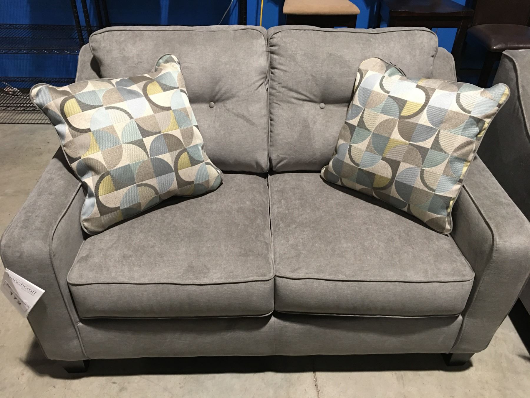 GREY UPHOLSTERED CONTEMPORARY LOVE SEAT WITH 2 THROW CUSHIONS