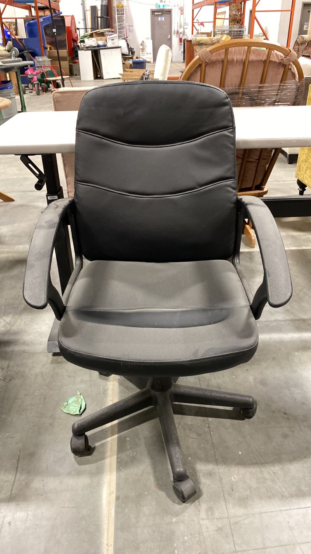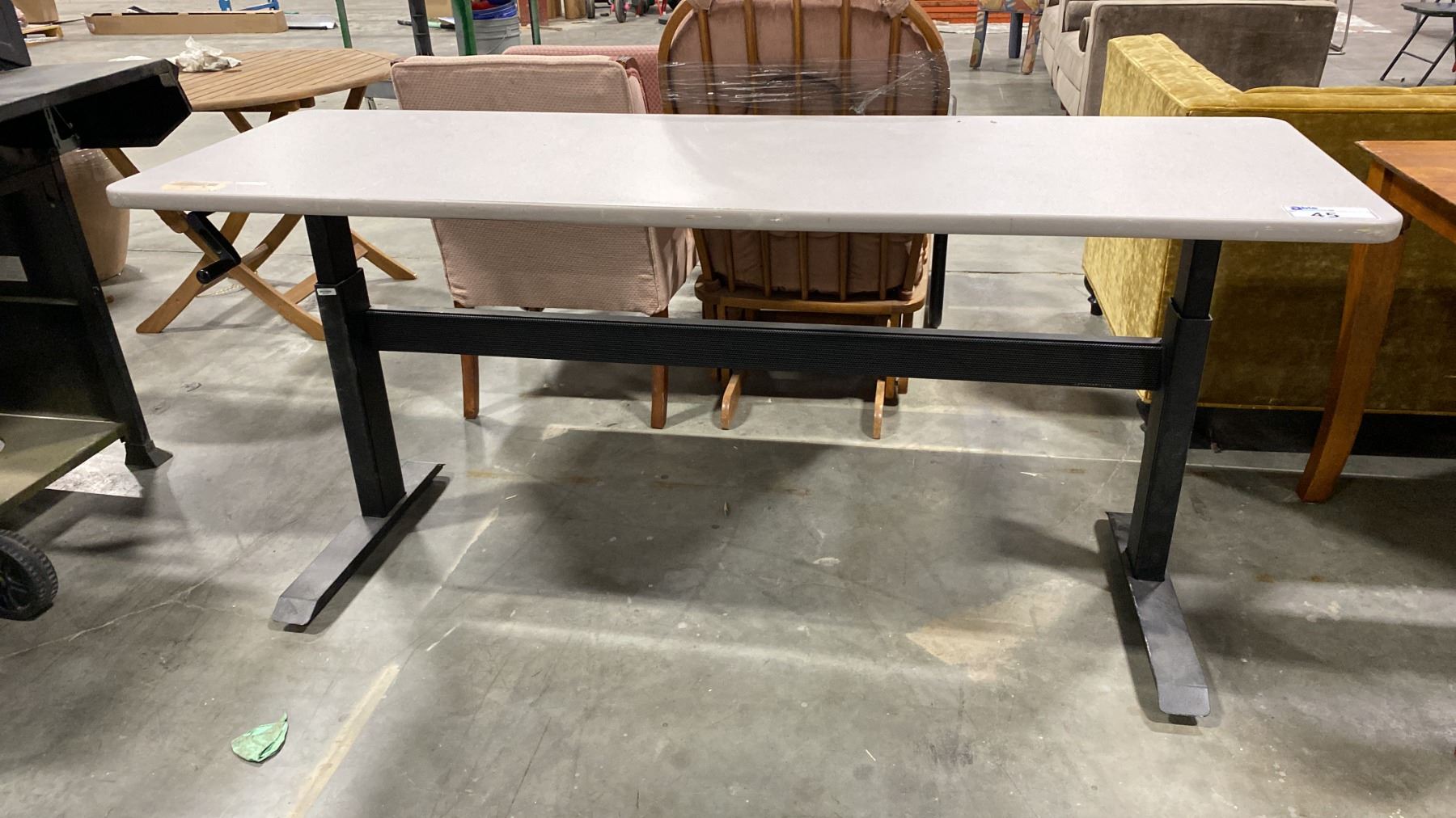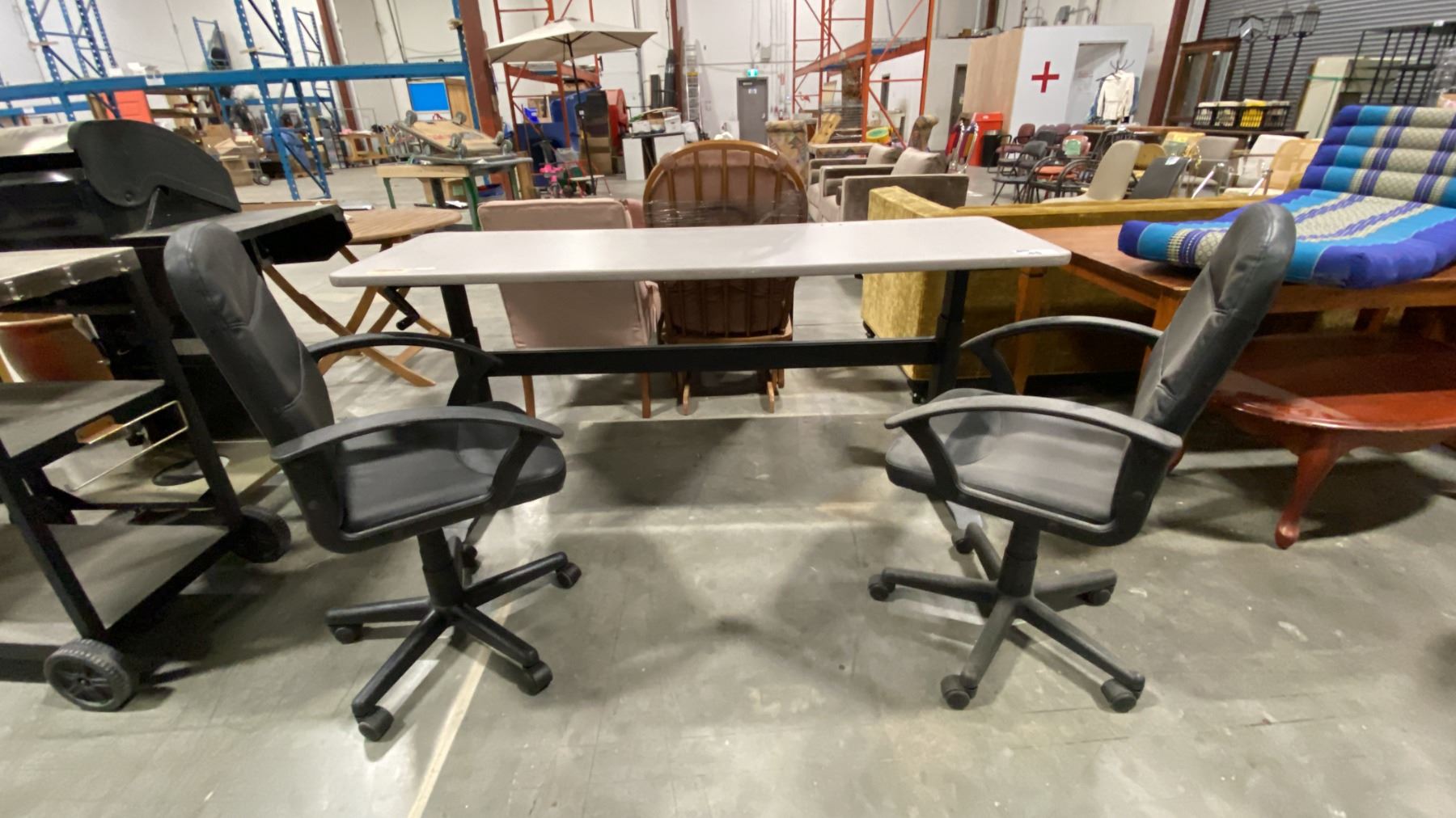 GREY WORKBENCH & TWO BLACK OFFICE CHAIRS - WORKBENCH MEASURES APPROX. 71"W X 23"D X 33"H
