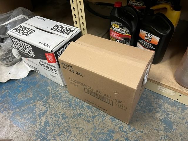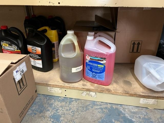 GROUP LOT. 10 GALLONS PLUMBING ANTIFREEZE, 6 GALLONS ENGINE ANTIFREEZE, 1 GALLON HYDRAULIC FLUID, 8 GALLONS DISTILLED WATER