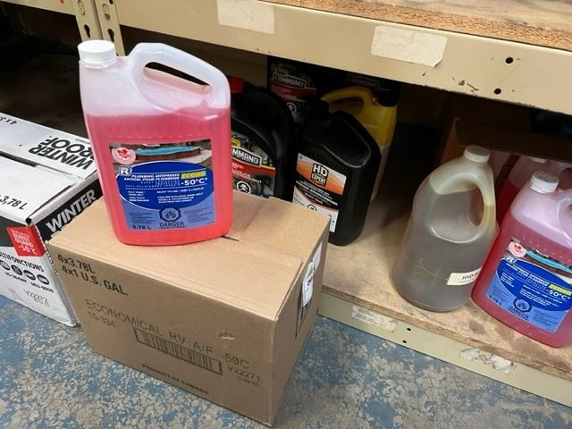 GROUP LOT. 10 GALLONS PLUMBING ANTIFREEZE, 6 GALLONS ENGINE ANTIFREEZE, 1 GALLON HYDRAULIC FLUID, 8