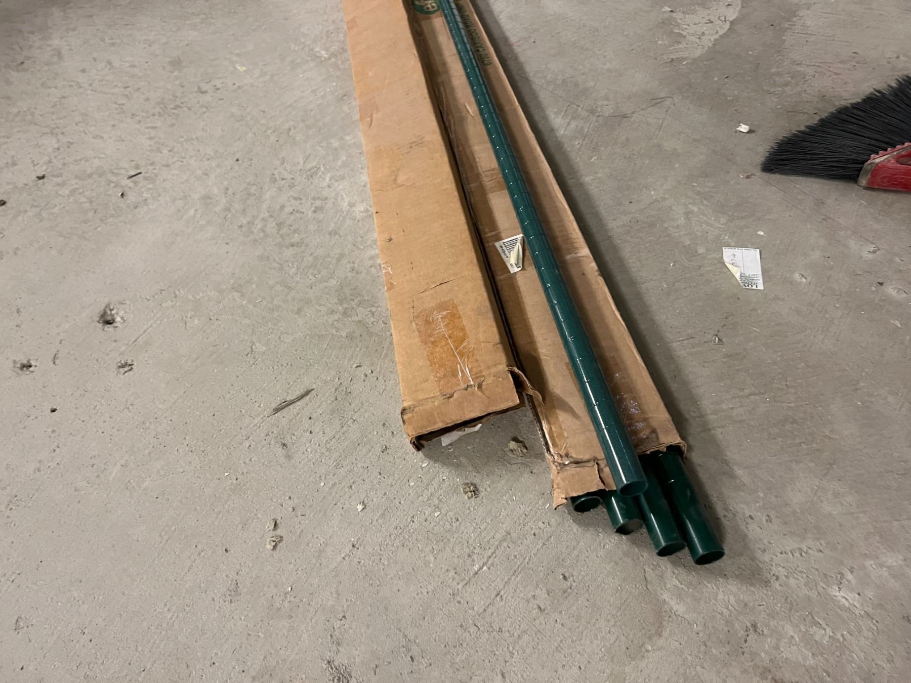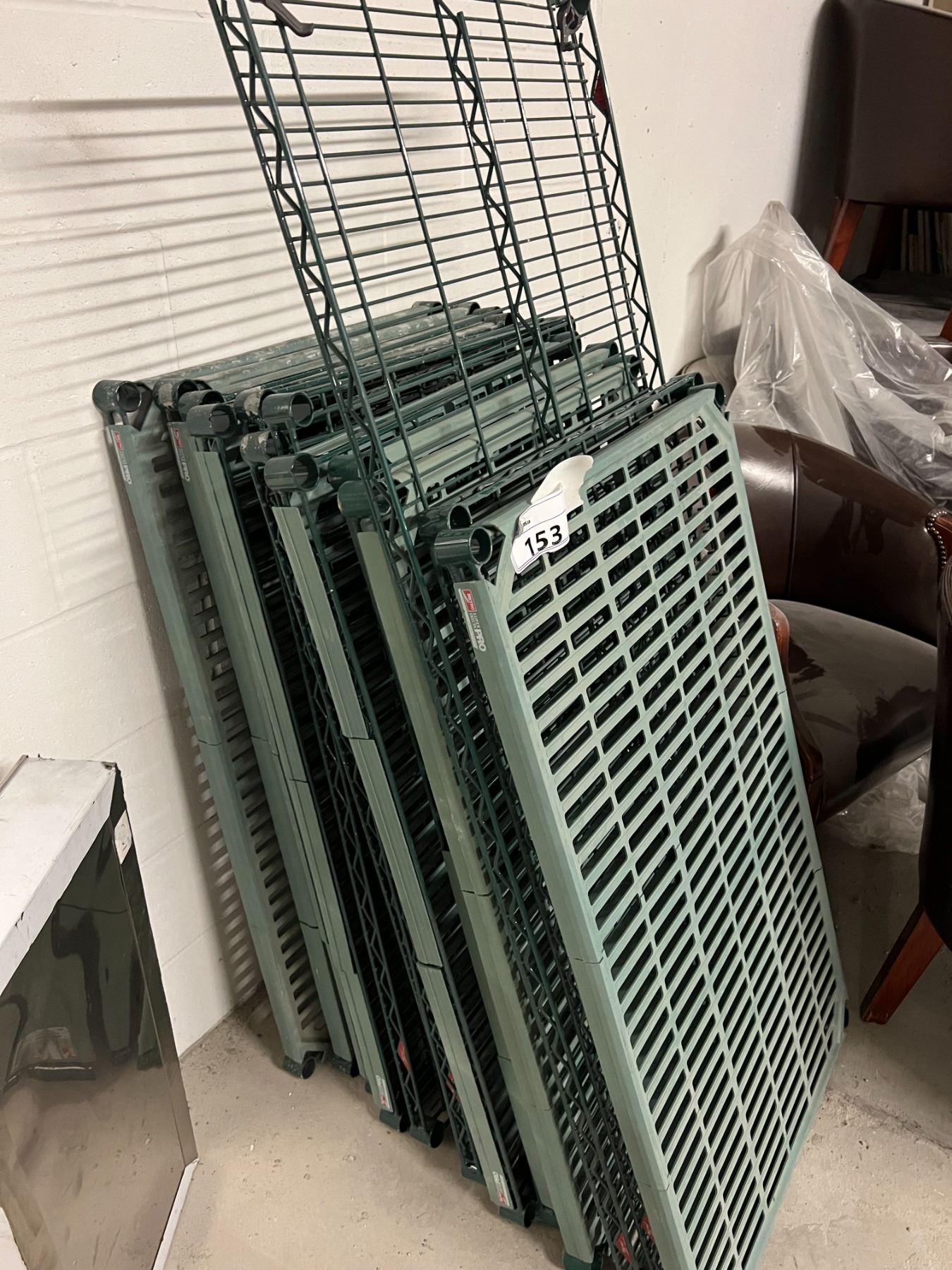 GROUP LOT 12 42X24" METRO RACK GREEN SHELVES WITH 8 POSTS. NO WHEELS, NO CLIPS