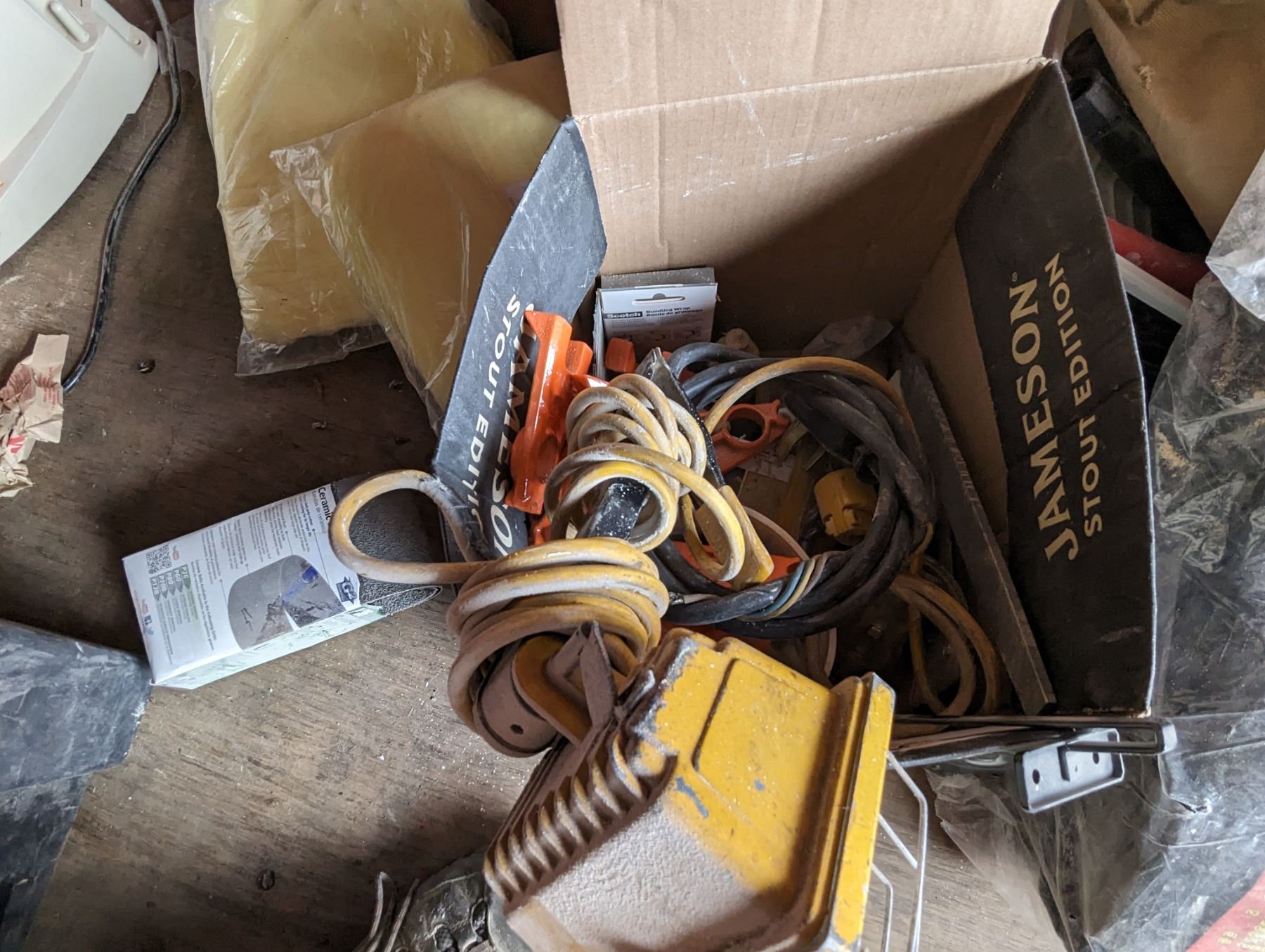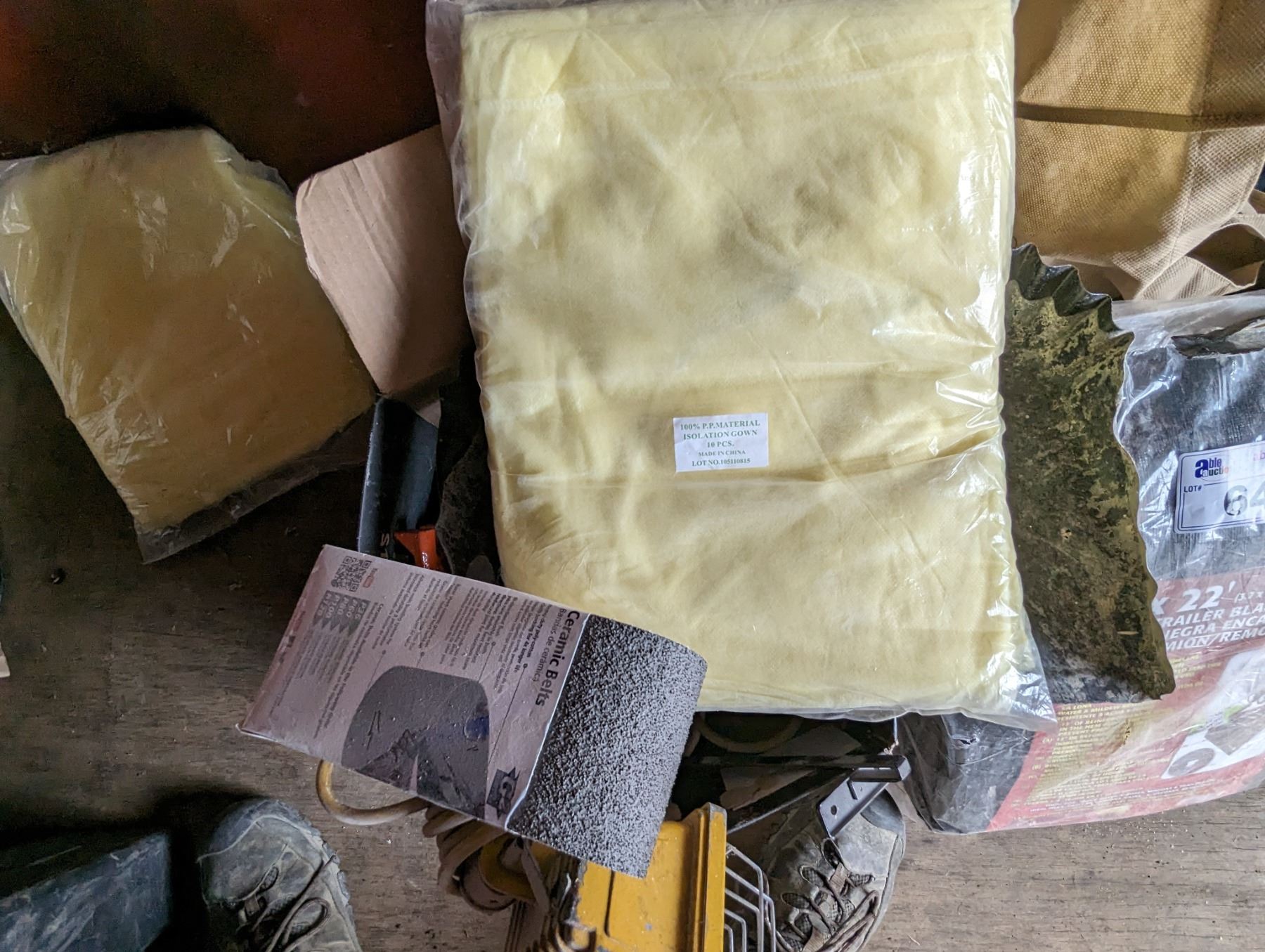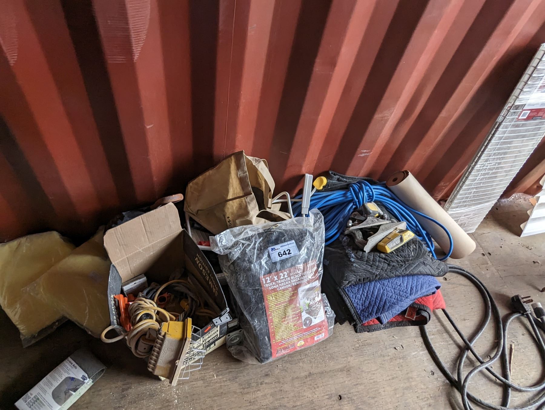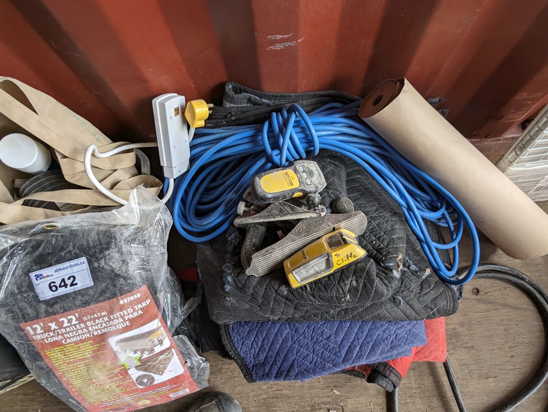 GROUP LOT 12' X 22' FITTED TRAILER TARPS, 3 MOVING PADS, 2' CRAFT PAPER ROLL, 100' BLUE EXTENSION CORD, WIRE SHELF KIT, HAND PLANERS, WORK LIGHT & 220V EXTENSION CORD ETC.
